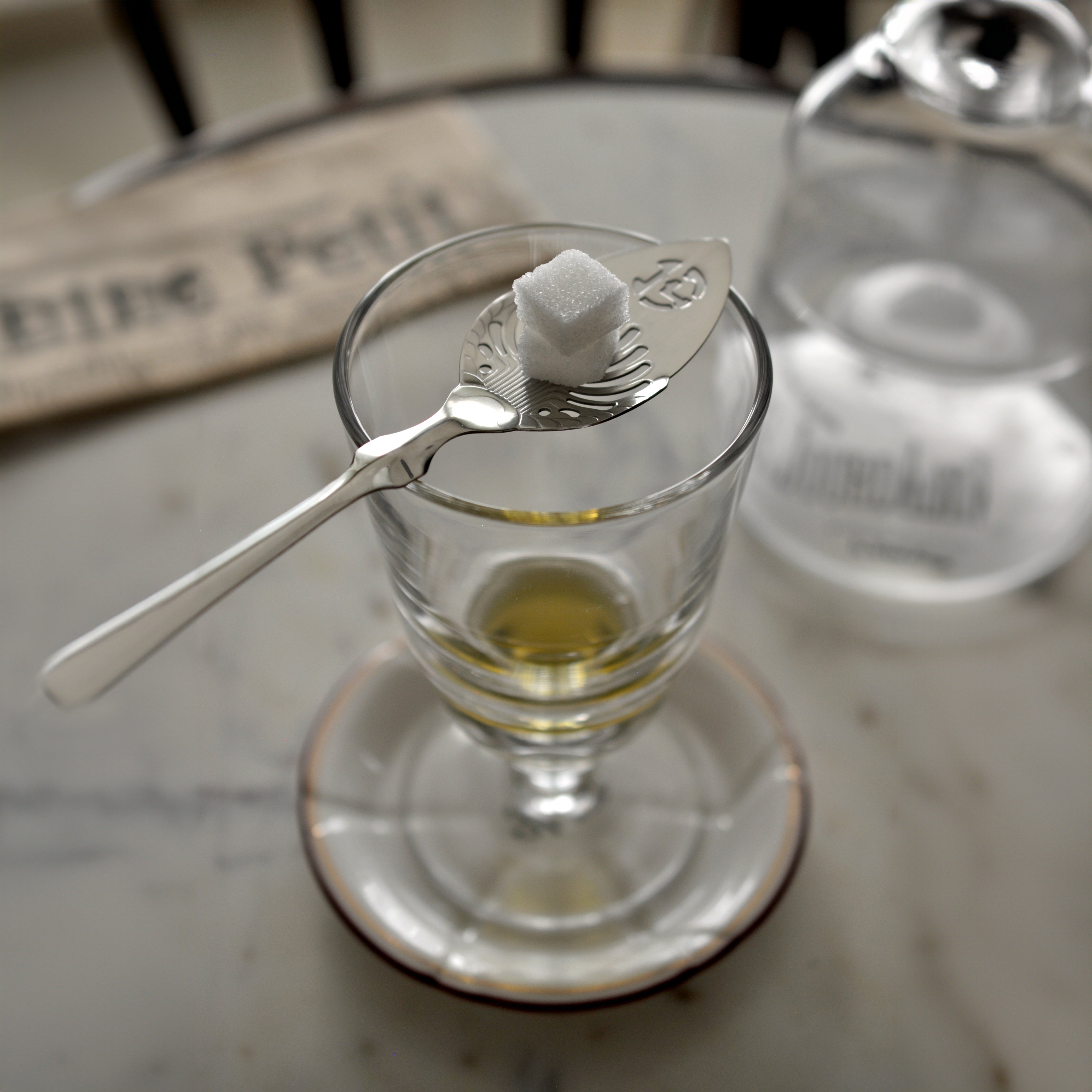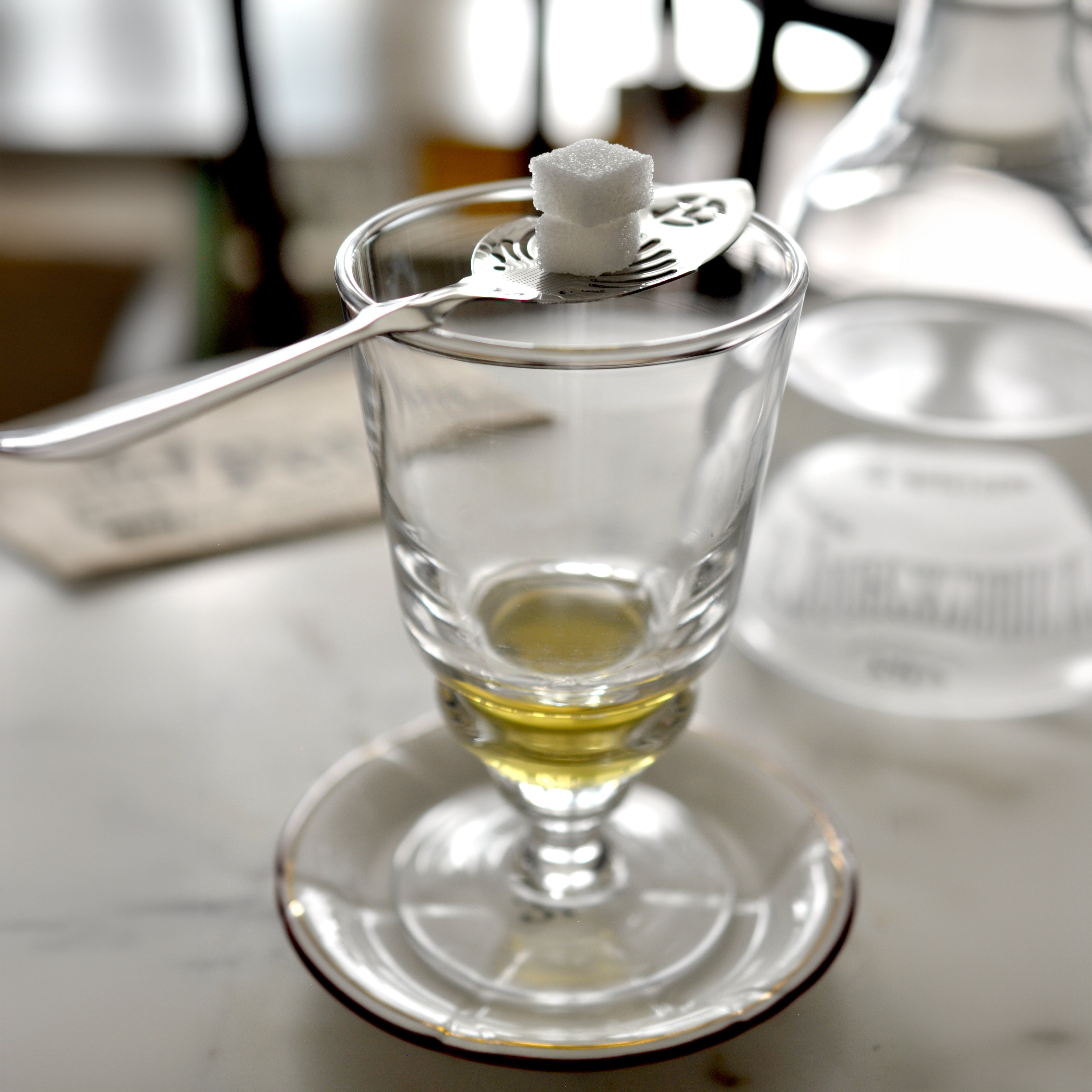 L'eau sucrée tombe de la cuillère dans le verre, se mélange à l'absinthe, libère des huiles essentielles et parfume l'air d'une odeur d'anis, de fenouil et de grande absinthe.