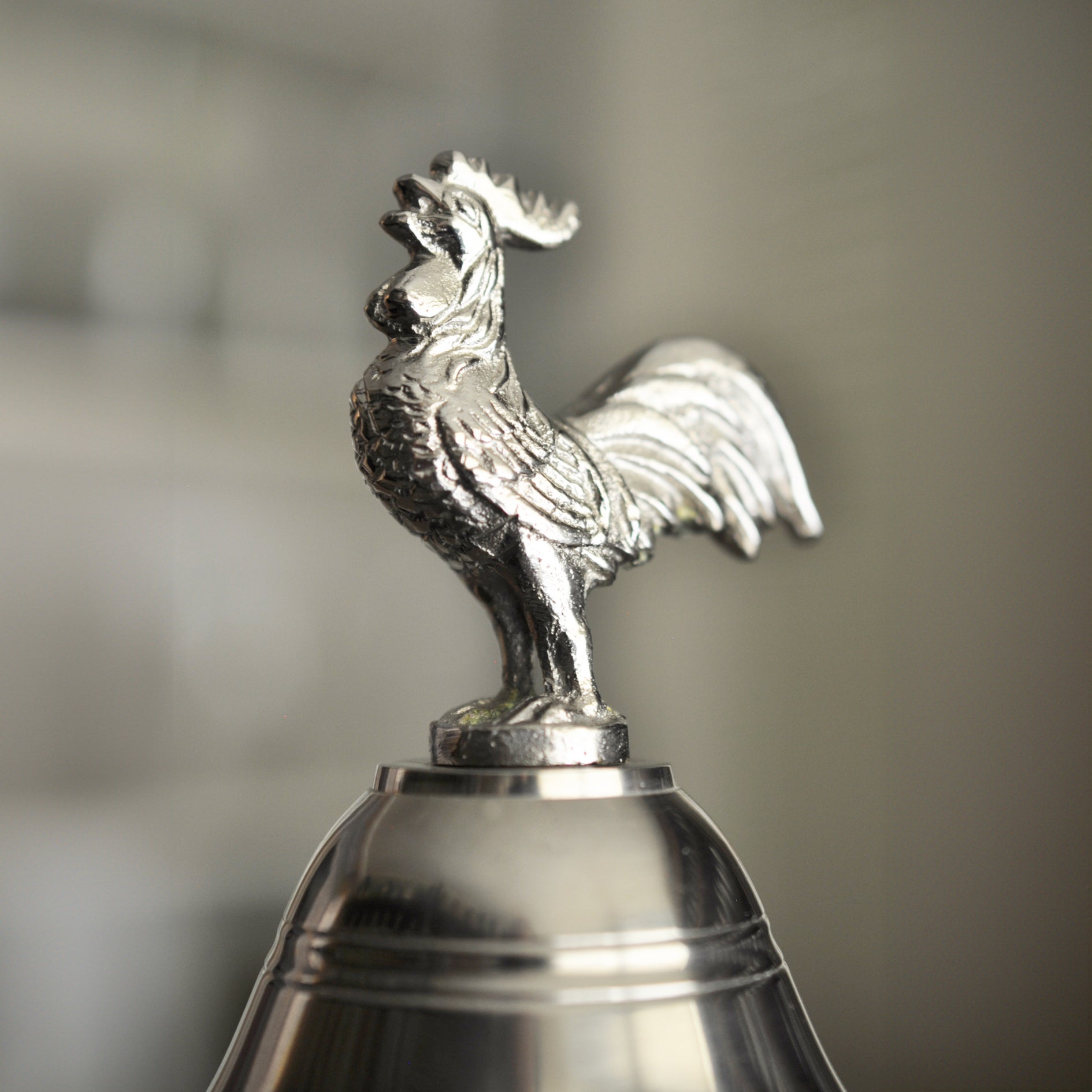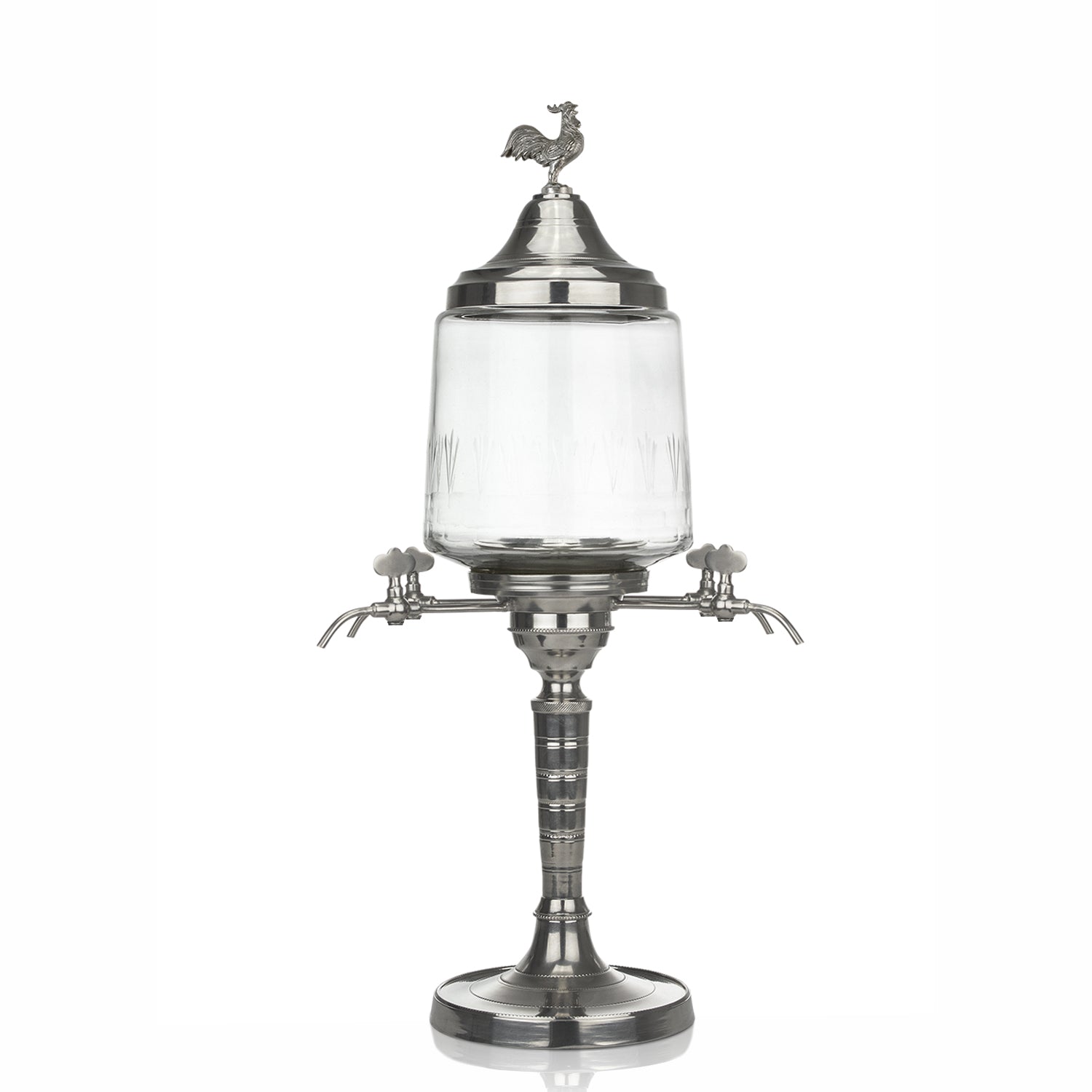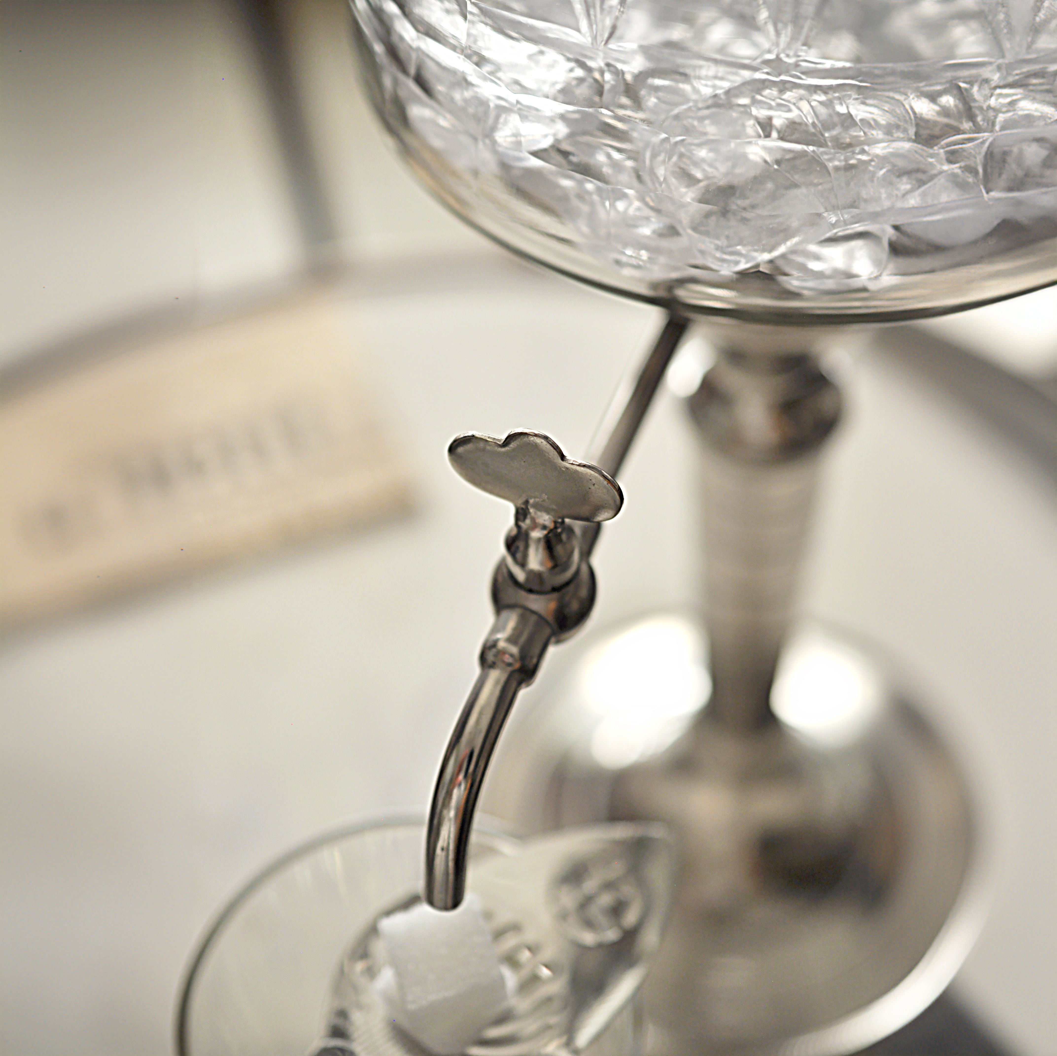 Cette rare fontaine à quatre robinets est une reproduction de la fontaine à absinthe Belle Époque du XIXe siècle. Le couvercle comporte un coq (symbole national de la France), qui est surtout connu pour être utilisé sur les très rares fontaines à absinthe antiques utilisées pour promouvoir l'Absinthe Terminus (une absinthe française populaire du XIXe siècle). Le couvercle est amovible pour ajouter de l'eau glacée dans le bol en verre, qui comprend un filtre à glace. Le bol en verre est soufflé à la bouche et la fontaine est fabriquée à la main.