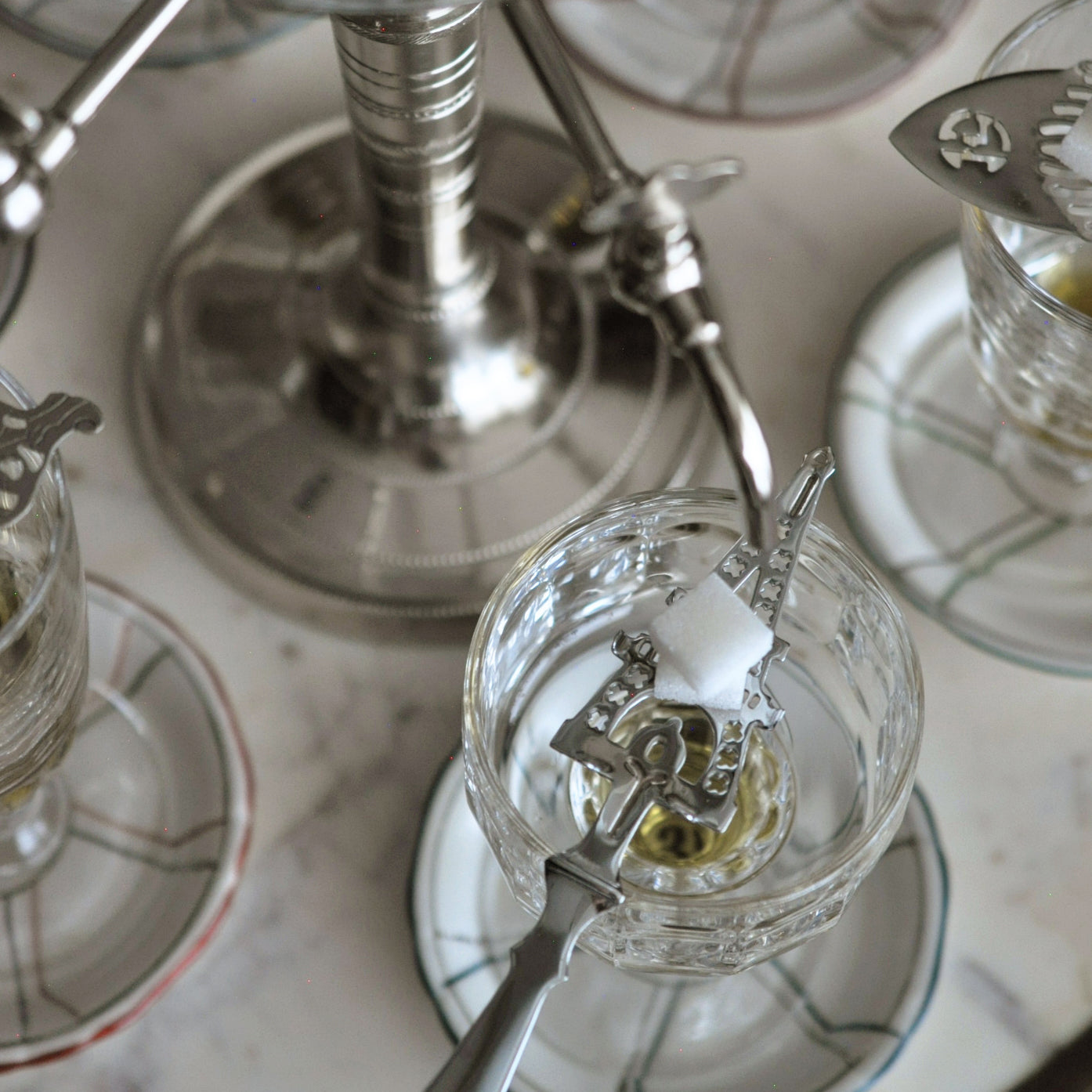 Le mélange devient également blanc laiteux lorsque l'eau se mélange à l'anis. Une fois le sucre dissous dans la cuillère, l'absinthe peut être goûtée et la force et la douceur peuvent être ajustées en ajoutant plus d'eau ou de sucre selon le goût. Le rapport de mélange dépend des préférences de chacun - généralement 1 part d'absinthe pour 3 à 5 parts d'eau. Au tournant du siècle dernier, les Français étaient très gourmands et utilisaient donc généralement une grande quantité de sucre. Renouvelez l'eau avant chaque utilisation.