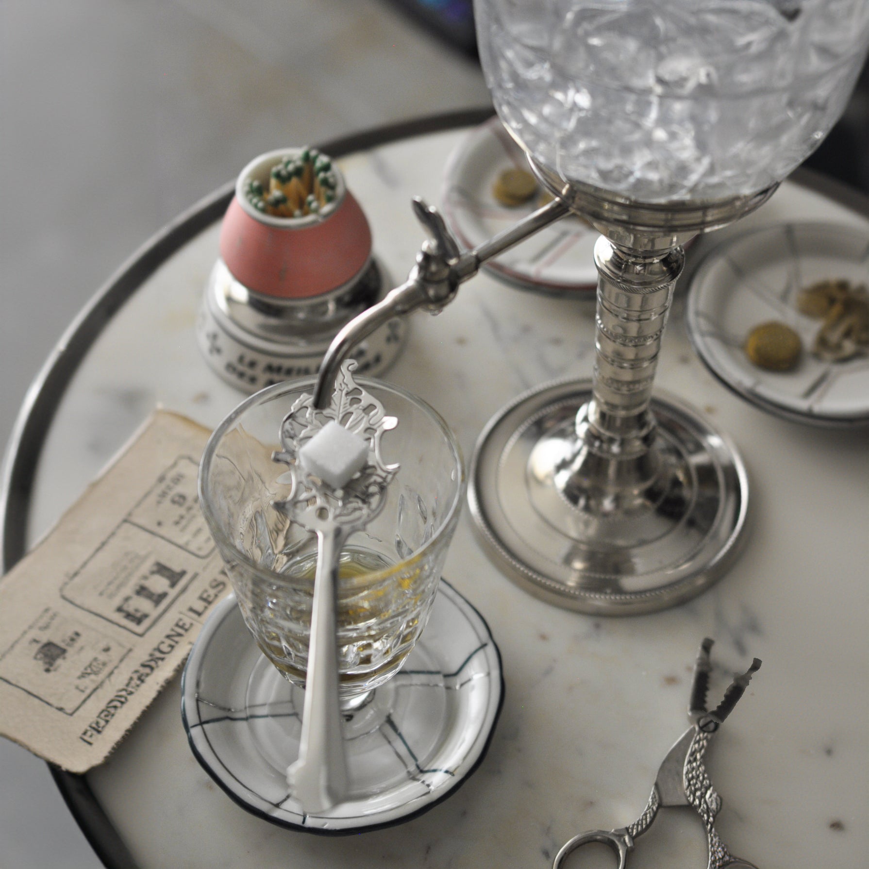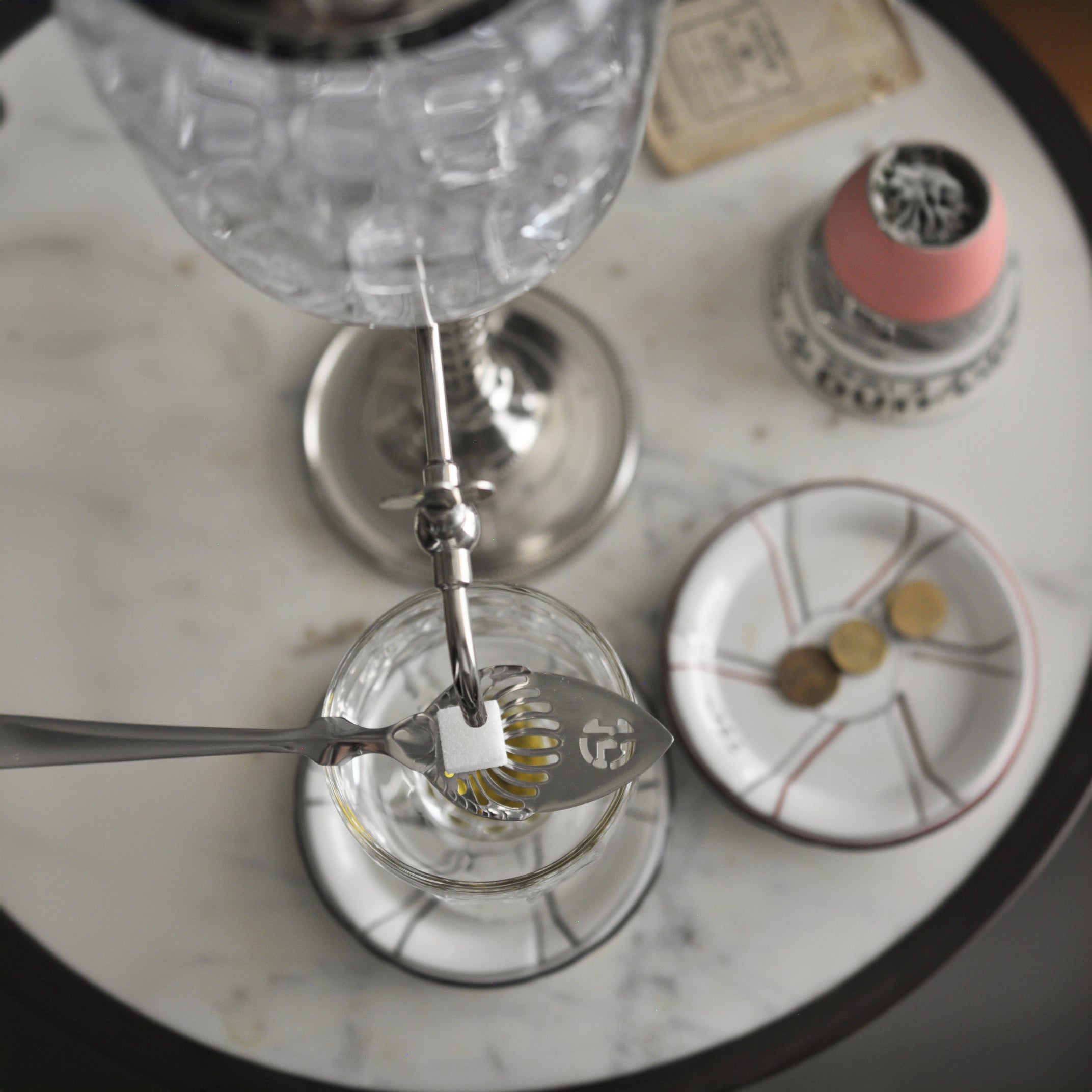 Le mélange devient également blanc laiteux lorsque l'eau se mélange à l'anis. Une fois le sucre dissous dans la cuillère, l'absinthe peut être goûtée et la force et la douceur peuvent être ajustées en ajoutant plus d'eau ou de sucre selon le goût. Le rapport de mélange dépend des préférences de chacun - généralement 1 part d'absinthe pour 3 à 5 parts d'eau. Au tournant du siècle dernier, les Français étaient très gourmands et utilisaient donc généralement une grande quantité de sucre. Renouvelez l'eau avant chaque utilisation.