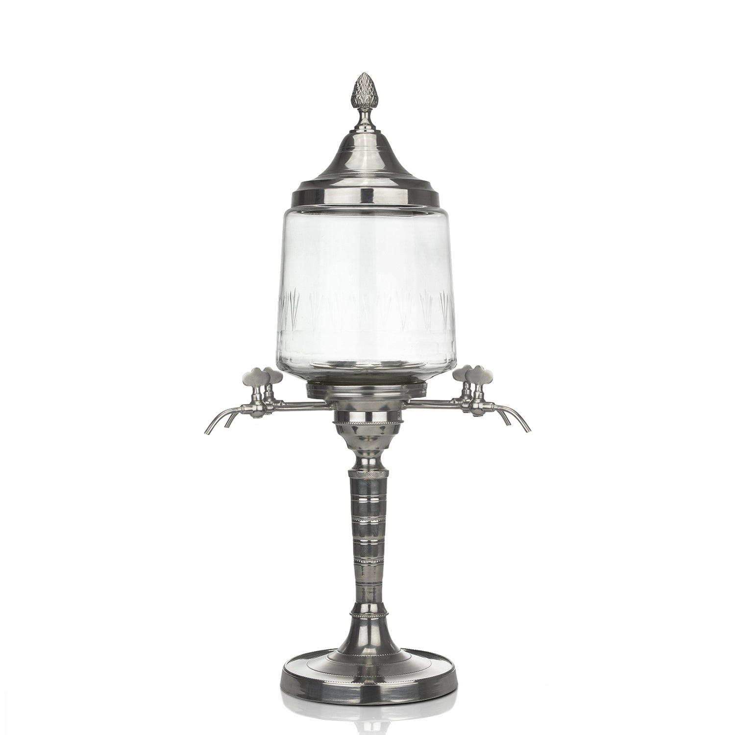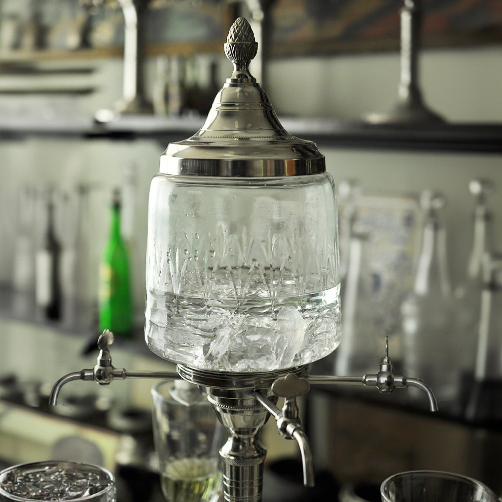 Cette fontaine est une reproduction exacte d'une fontaine à absinthe Belle Époque de la fin du XIXe siècle. Le couvercle est orné du classique fleuron "ananas" et est amovible pour ajouter de l'eau glacée dans le bol en verre, qui comprend un filtre à eau. Le bol en verre est soufflé à la bouche et la fontaine est fabriquée à la main.
