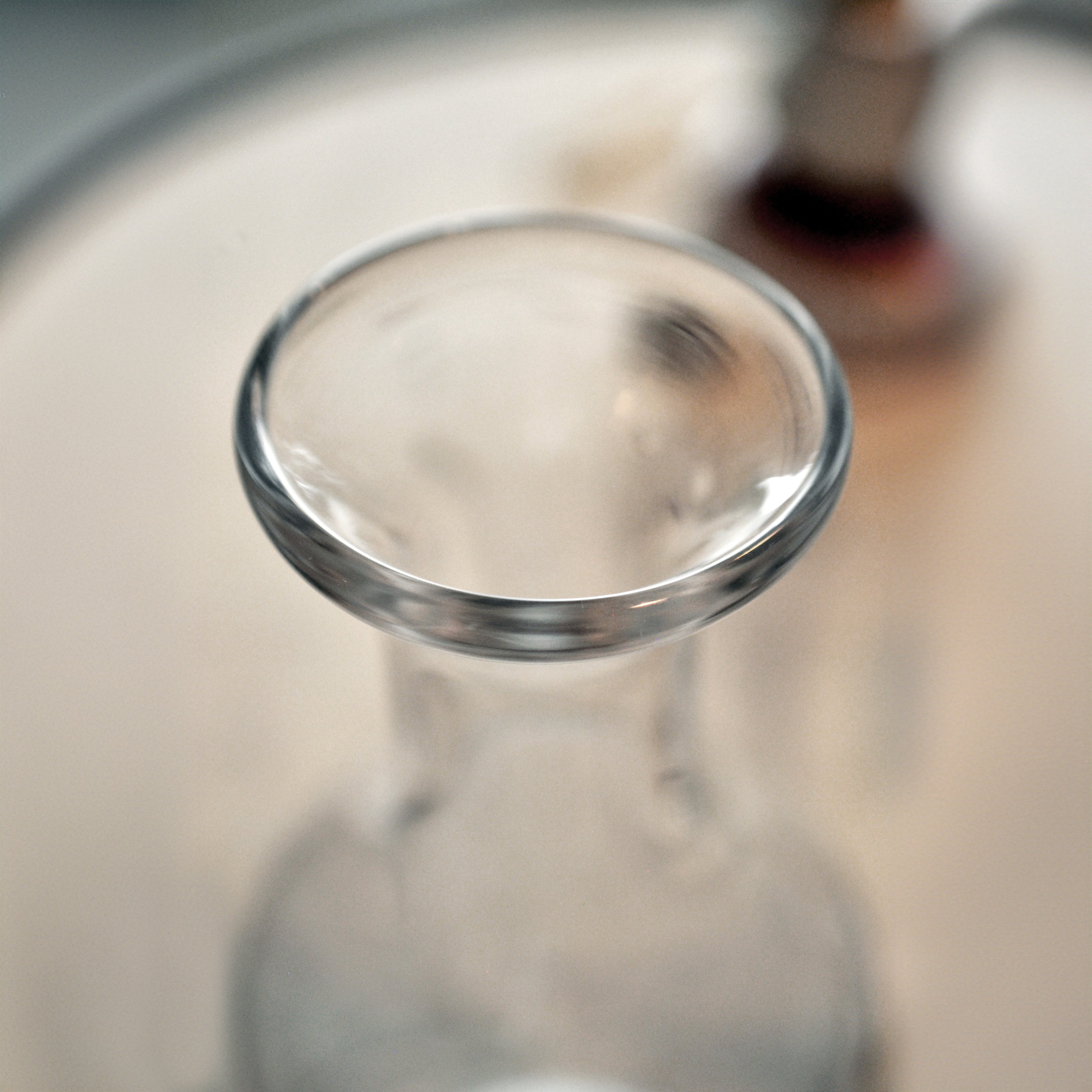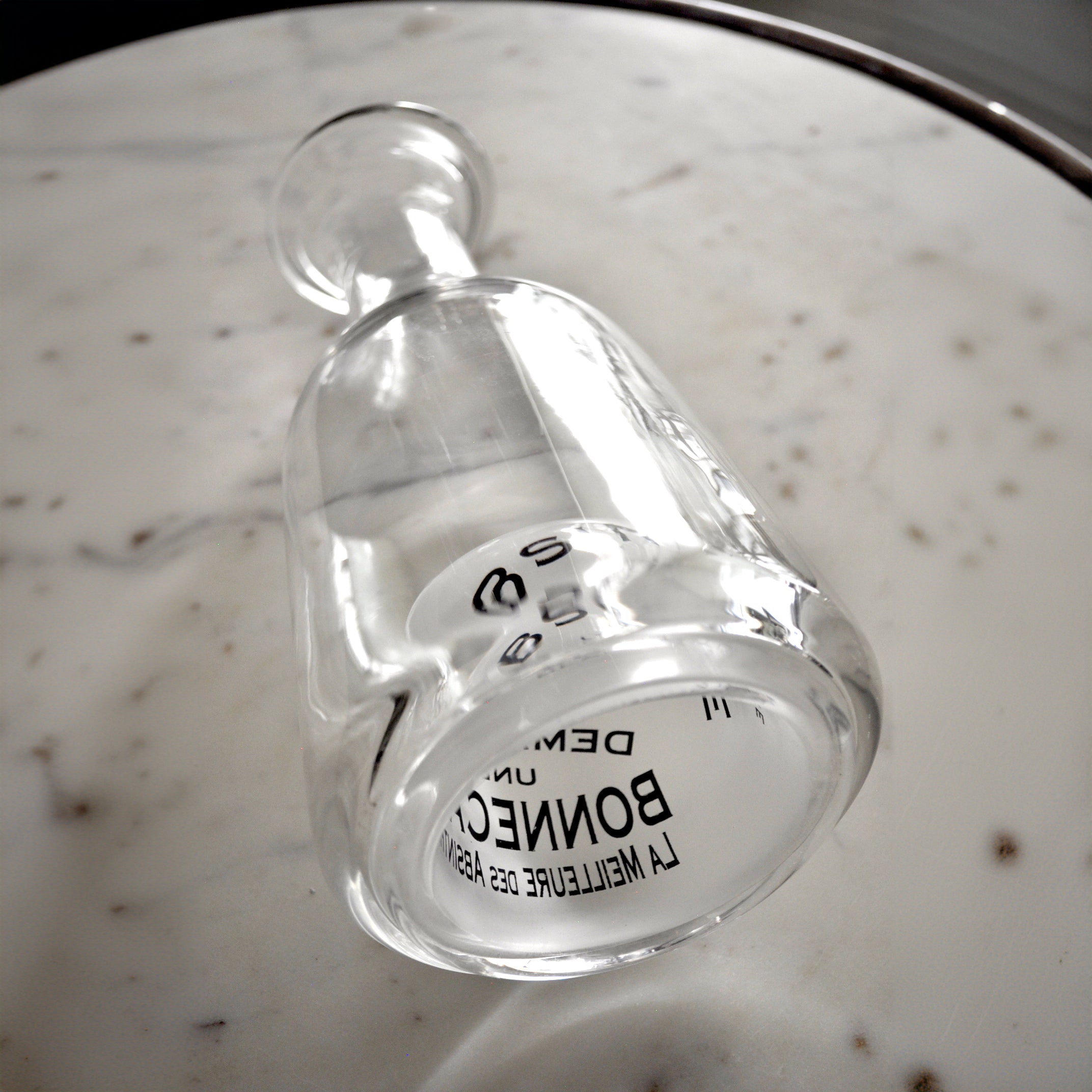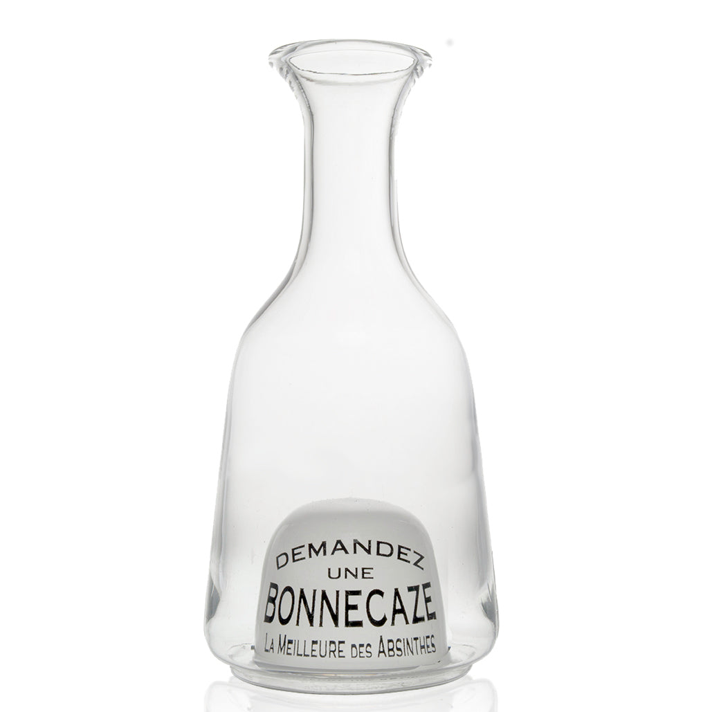 Cette carafe inhabituelle soufflée à la bouche a été inspirée par des pièces similaires trouvées dans les bars et les bistrots de toute l'Europe à la fin du XIXe siècle. Une fois que l'eau est ajoutée à la carafe, elle agit comme un grossisseur et agrandit le texte sur le dôme. Le creux en forme de dôme au fond de la carafe est appelé la boucle, ou loupe, ce qui signifie loupe en français. Ce grossissement était un moyen utile pour attirer l'attention en tant qu'outil de marketing populaire.