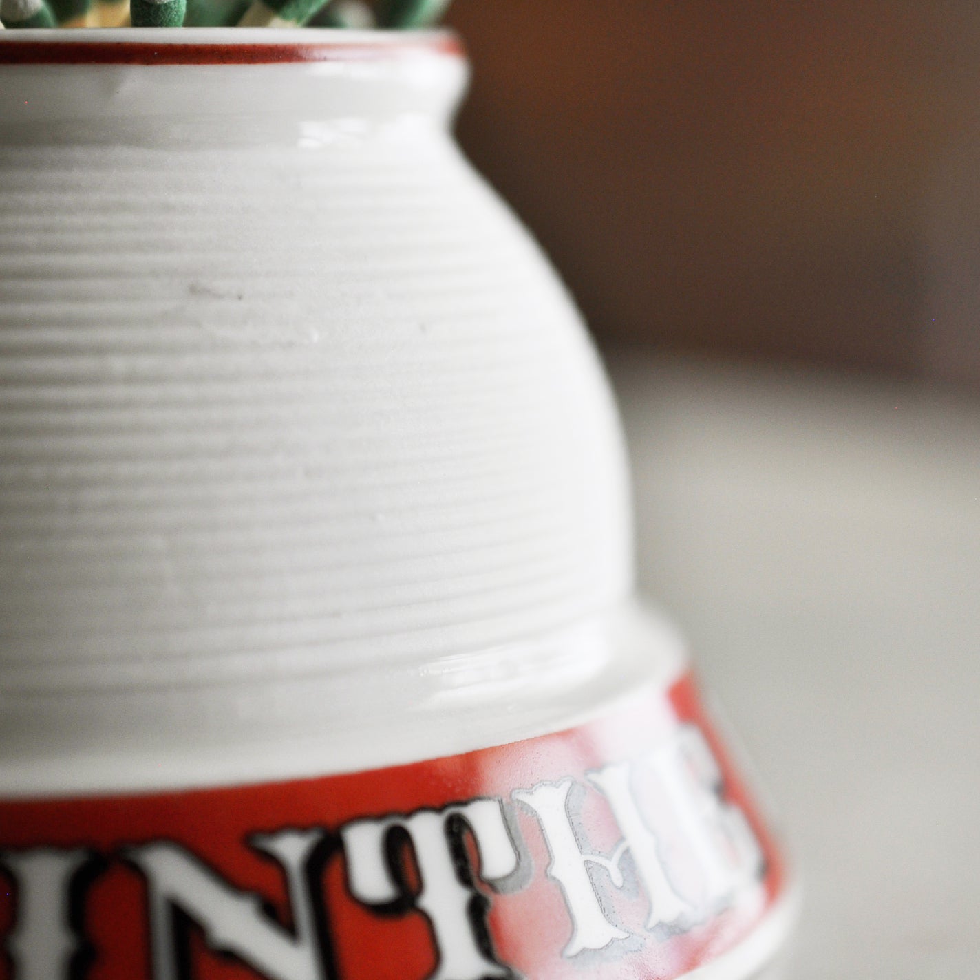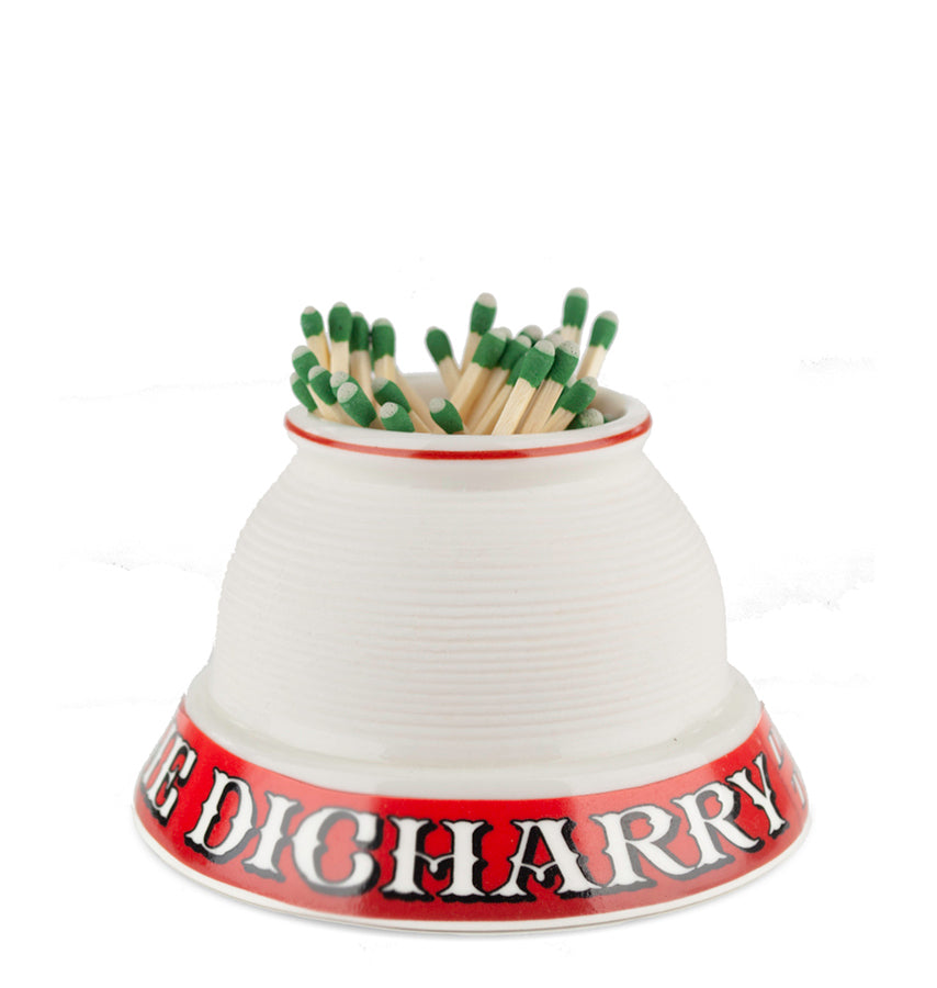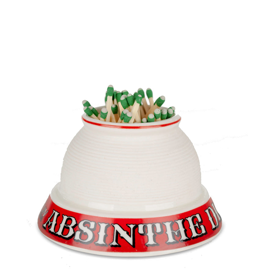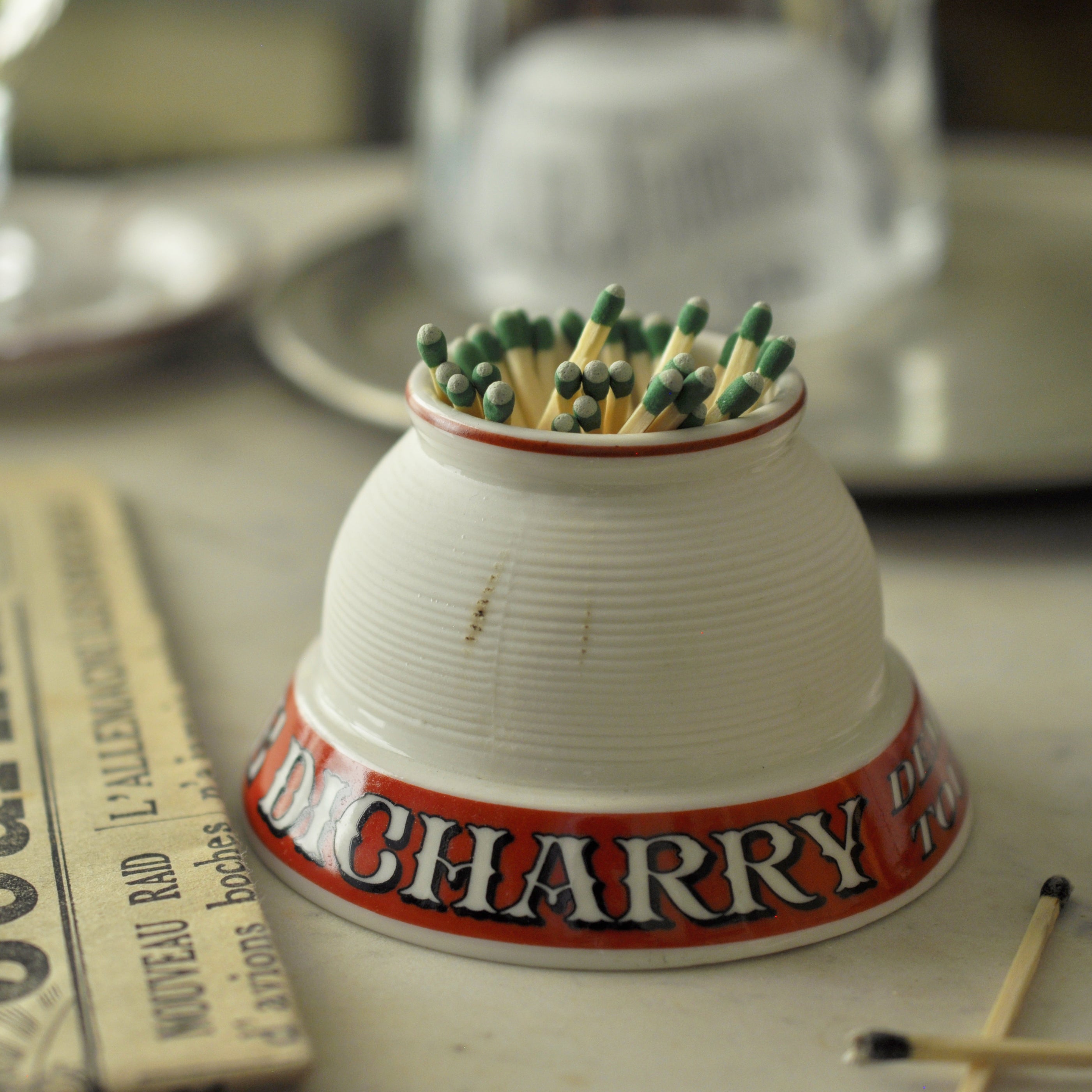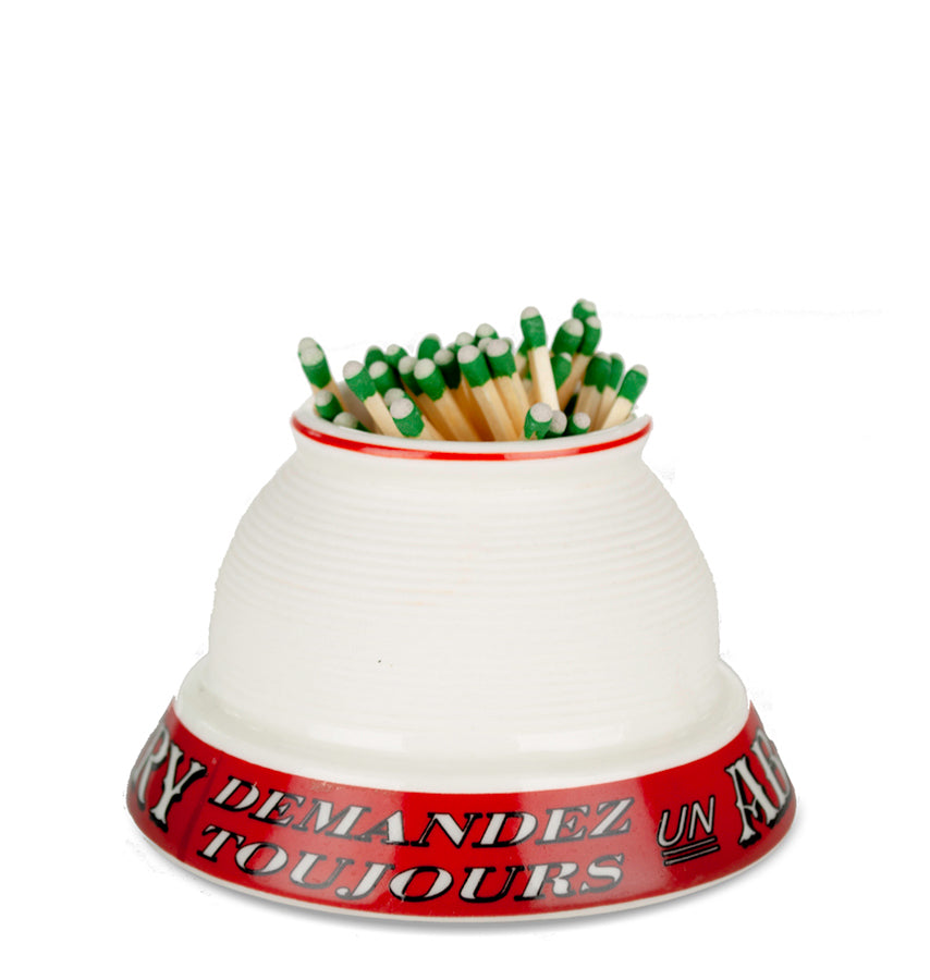 Ce pyrogène unique est une reproduction de ceux que l'on trouve dans toute l'Europe (et en particulier - France) de la fin du XIXe et du début du XXe siècle. À l'époque, il était courant de voir un pyrogène posé sur une table de bistro ou un bar. Les pyrogènes avaient trois objectifs. Premièrement, le récipient cylindrique supérieur était utilisé pour contenir les allumettes. Ensuite, la surface striée sur le côté (ou la base) servait à frapper et à allumer l'allumette. Et enfin, la pièce servait de support publicitaire. De nombreuses entreprises utilisaient de tels articles pour promouvoir leurs produits, et étaient généralement fournis gratuitement au bar.