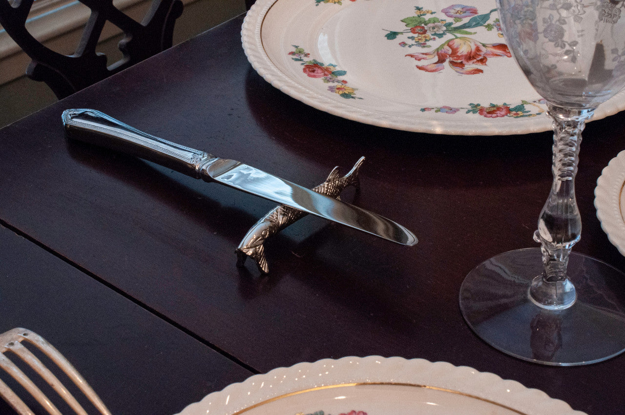 Nos porte-couteaux en étain sont à la fois attrayants et pratiques en offrant un endroit pour reposer votre couteau pendant que vous mangez. Lorsqu'ils ne se servent pas de leur couteau à table, beaucoup de gens se rendent compte qu'il n'y a pas d'autre endroit pour poser leur couteau que sur le côté de leur assiette. Non seulement cette situation est peu attrayante, mais en plus, le couteau glisse souvent de l'assiette, salissant la table ou la nappe. Cette reproduction d'un porte-couteau français d'époque apporte une solution intéressante à ce problème et constitue un merveilleux moyen de compléter un service de table.
