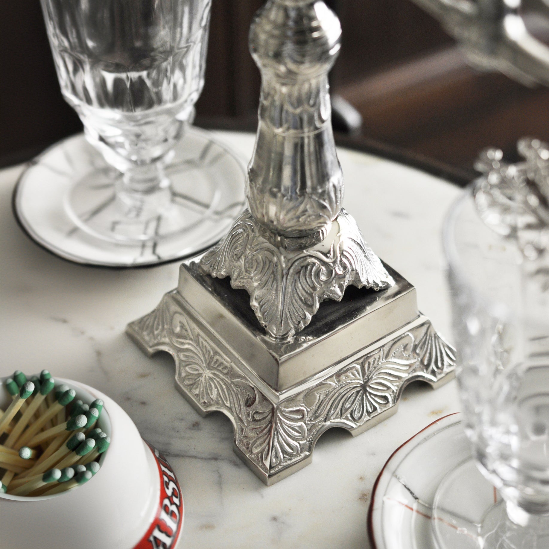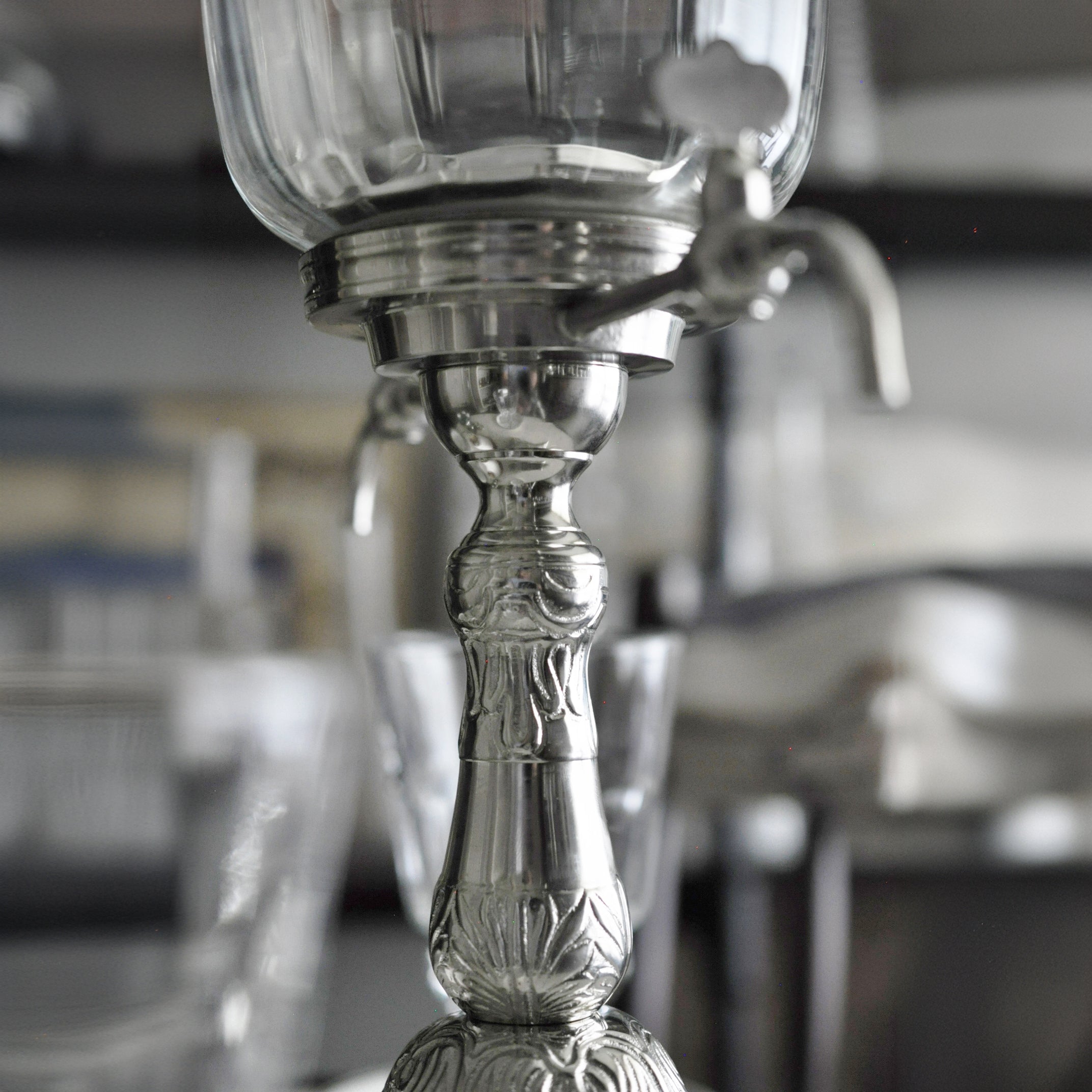 Cette fontaine est une magnifique variante d'une reproduction de fontaine à absinthe de la Belle Époque de la fin du XIXe siècle. Le bol en verre est soufflé à la bouche et les fontaines sont faites à la main.