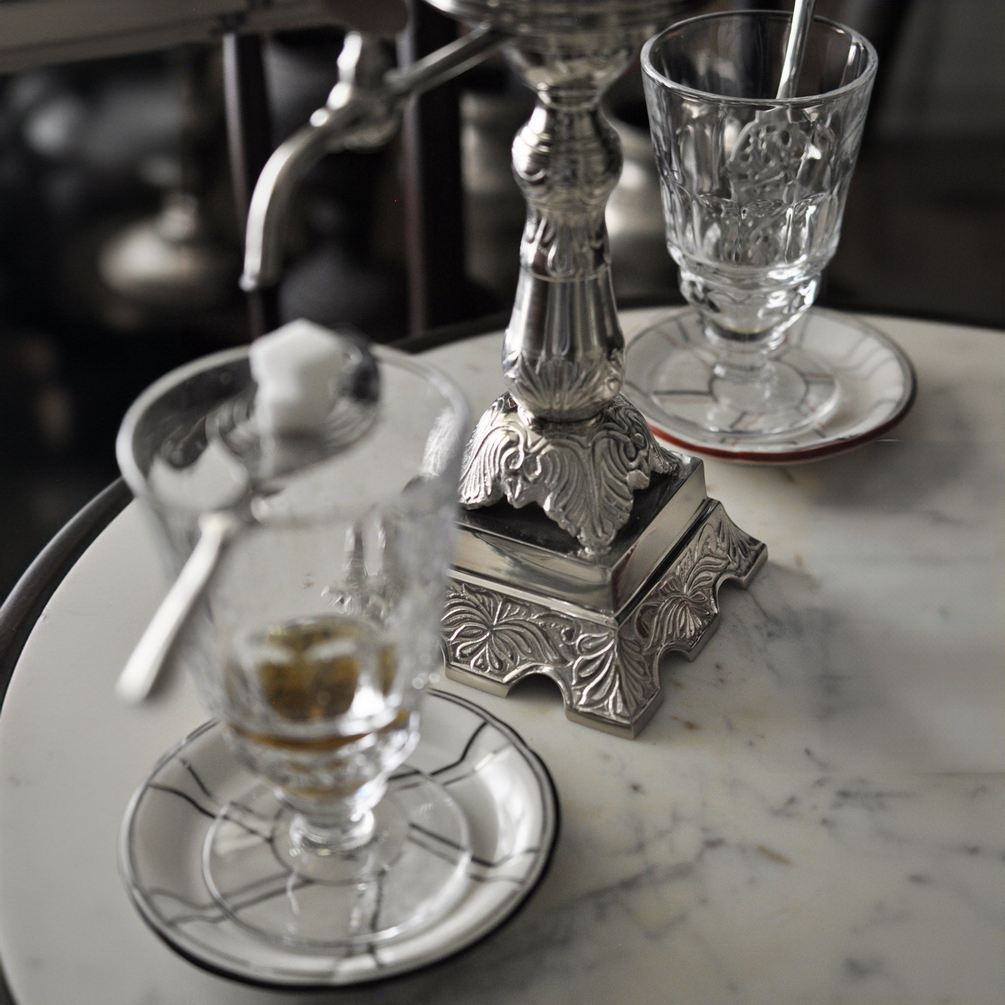 Les fontaines à absinthe étaient surtout utilisées dans les bars haut de gamme en raison de leur prix élevé. Elles étaient apportées à la table, où le client préparait lui-même l'absinthe. Les fontaines à absinthe étaient (et sont toujours) le moyen préféré pour préparer l'absinthe, car on peut parfaitement contrôler le débit d'eau. Mais malheureusement, à cause d'accidents, très peu de fontaines ont survécu intactes avec leur bol en verre d'origine.