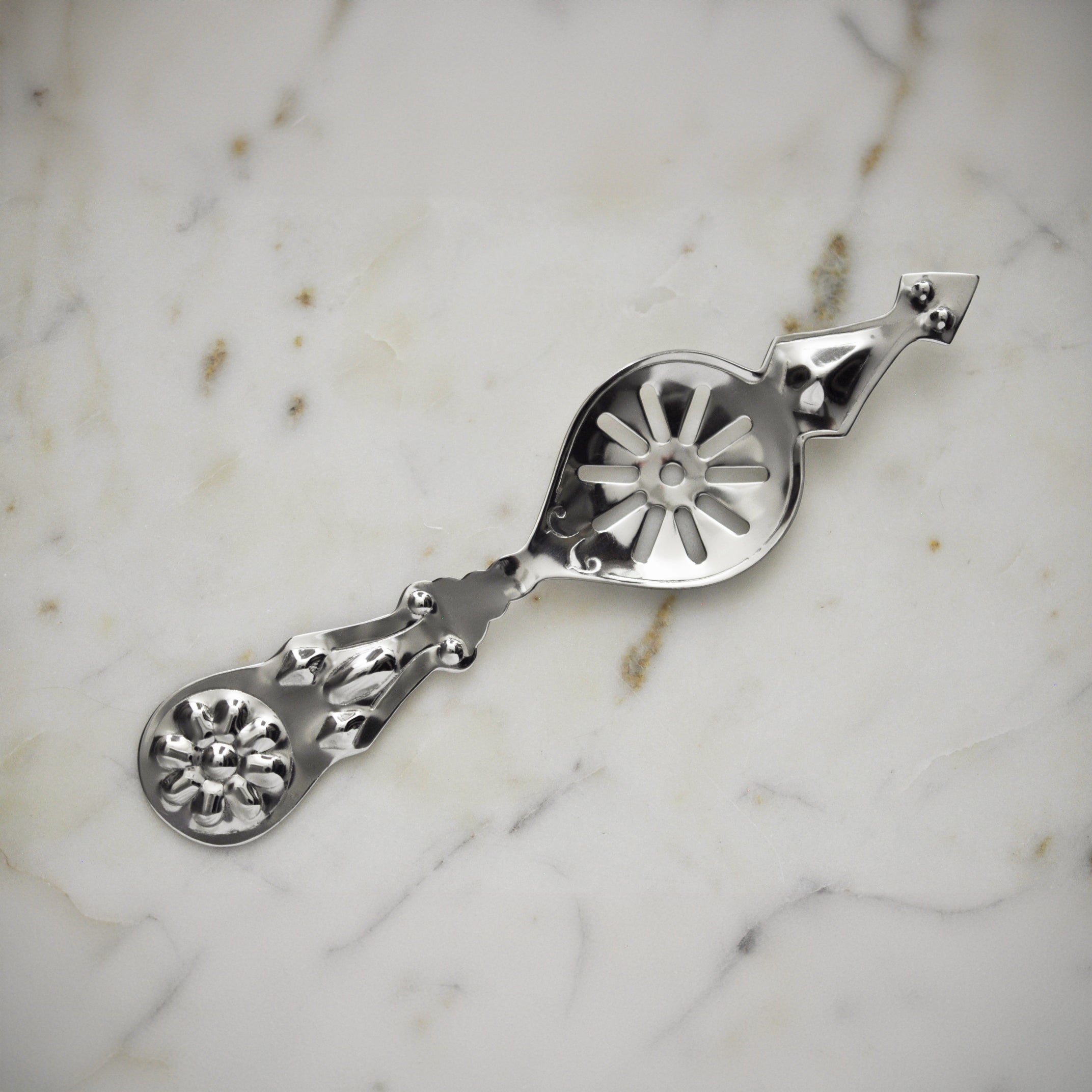 Une de nos cuillères les plus ornées et les plus populaires, cette reproduction fidèle est considérée comme l'une des plus collectionnables de toutes les cuillères à absinthe antiques. Cette cuillère à absinthe en forme de fleur présente une grande surface plate lui permettant d'accueillir de grands verres à absinthe. La grille comporte 10 fentes de forme circulaire où l'on place le sucre et où l'on fait couler ou égoutter l'eau froide. Il s'agit d'une reproduction exacte d'une cuillère à absinthe antique du début du siècle dernier.