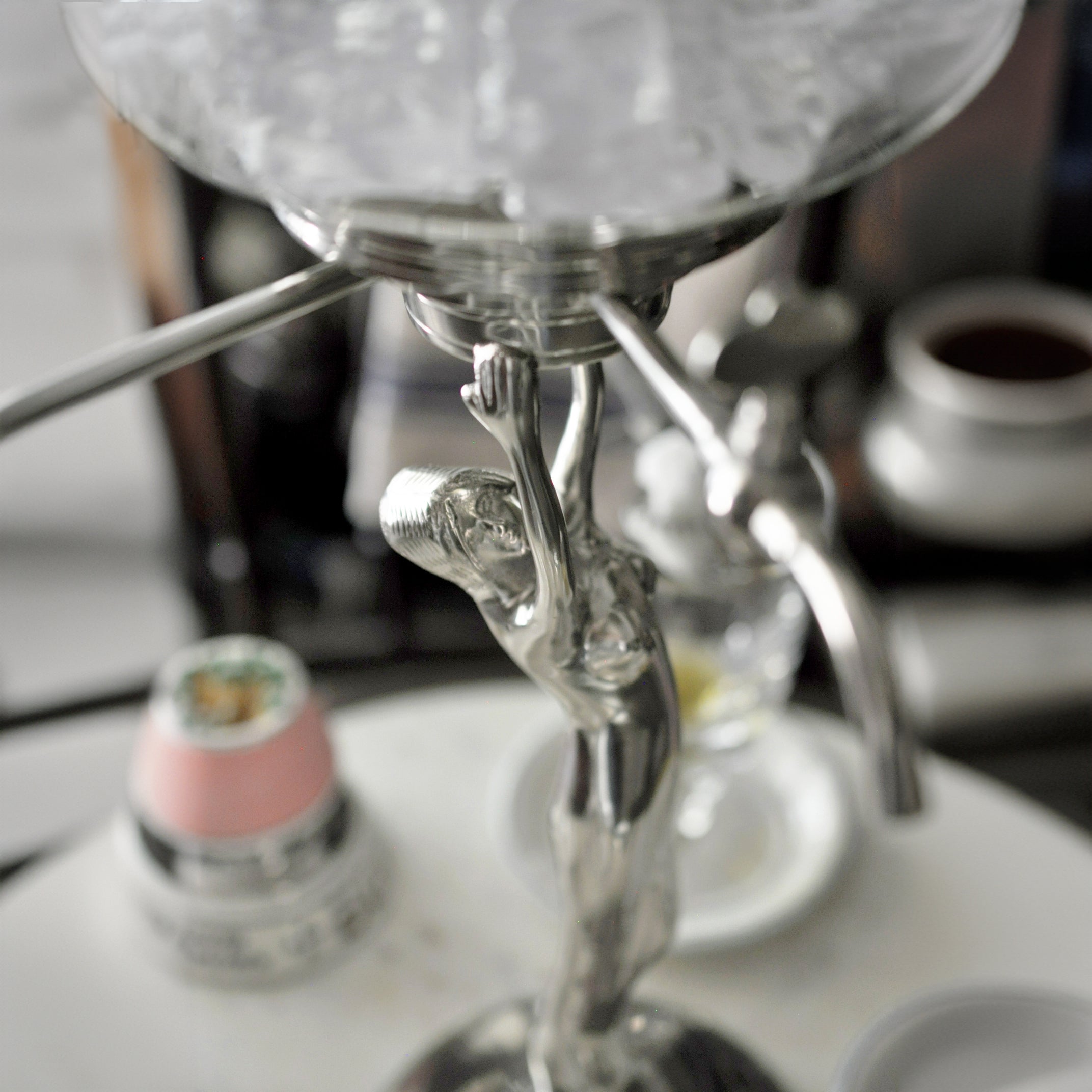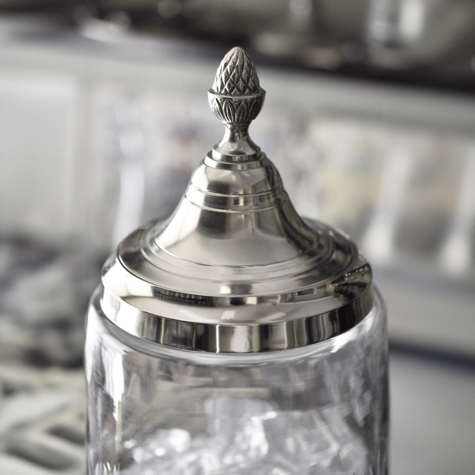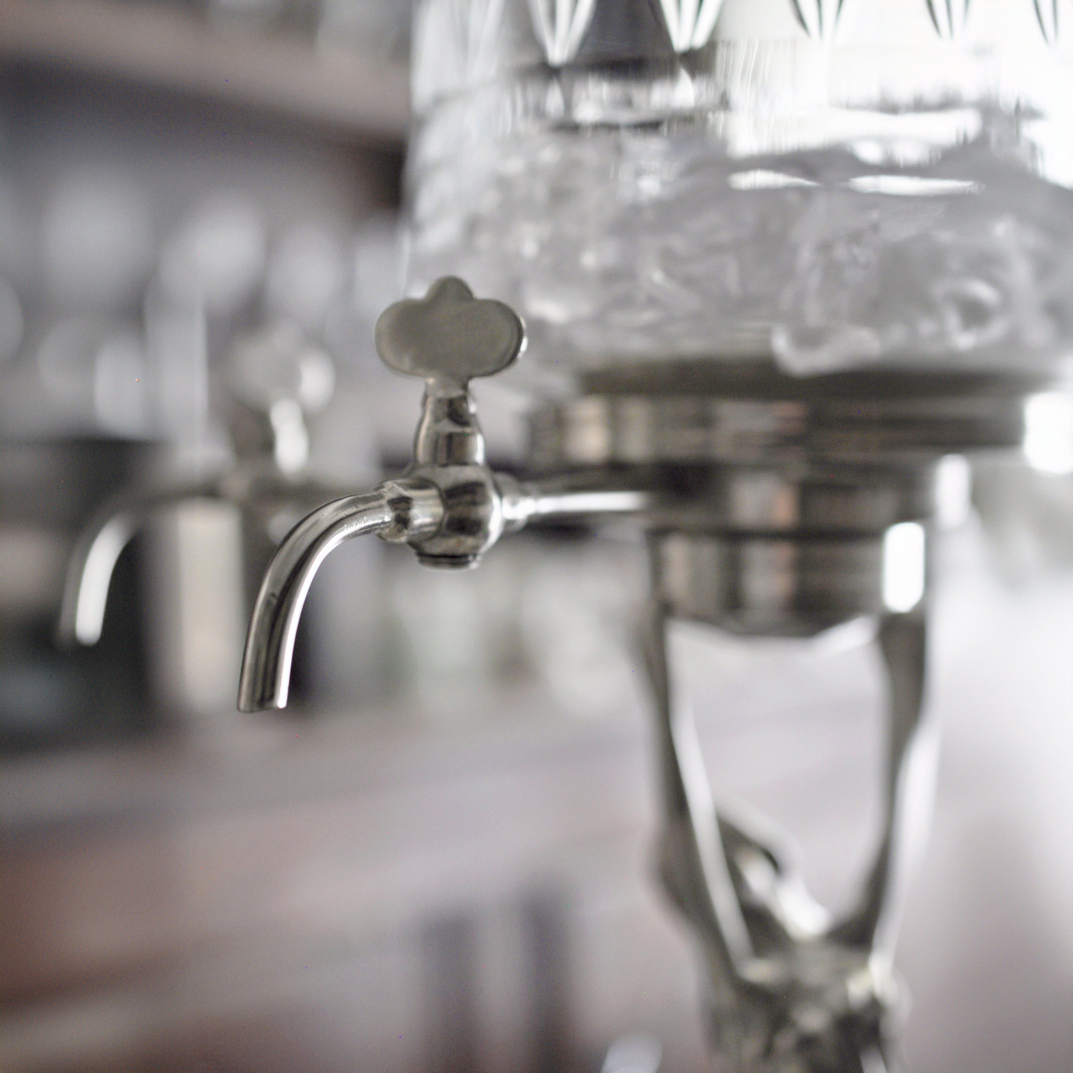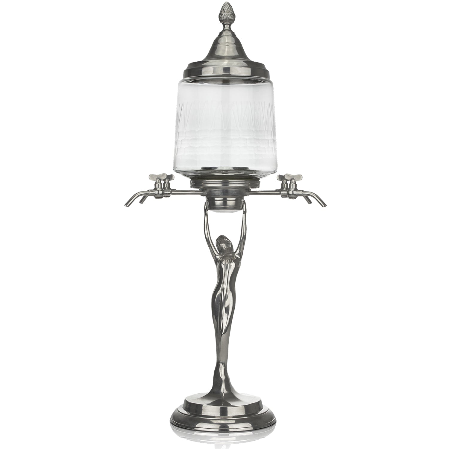 Le couvercle est orné du classique fleuron "ananas" et est amovible pour ajouter de l'eau glacée dans le bol en verre, qui comprend un filtre à eau. L'ananas représente l'hospitalité et l'amitié. Le bol en verre est soufflé à la bouche et la fontaine est fabriquée à la main.
