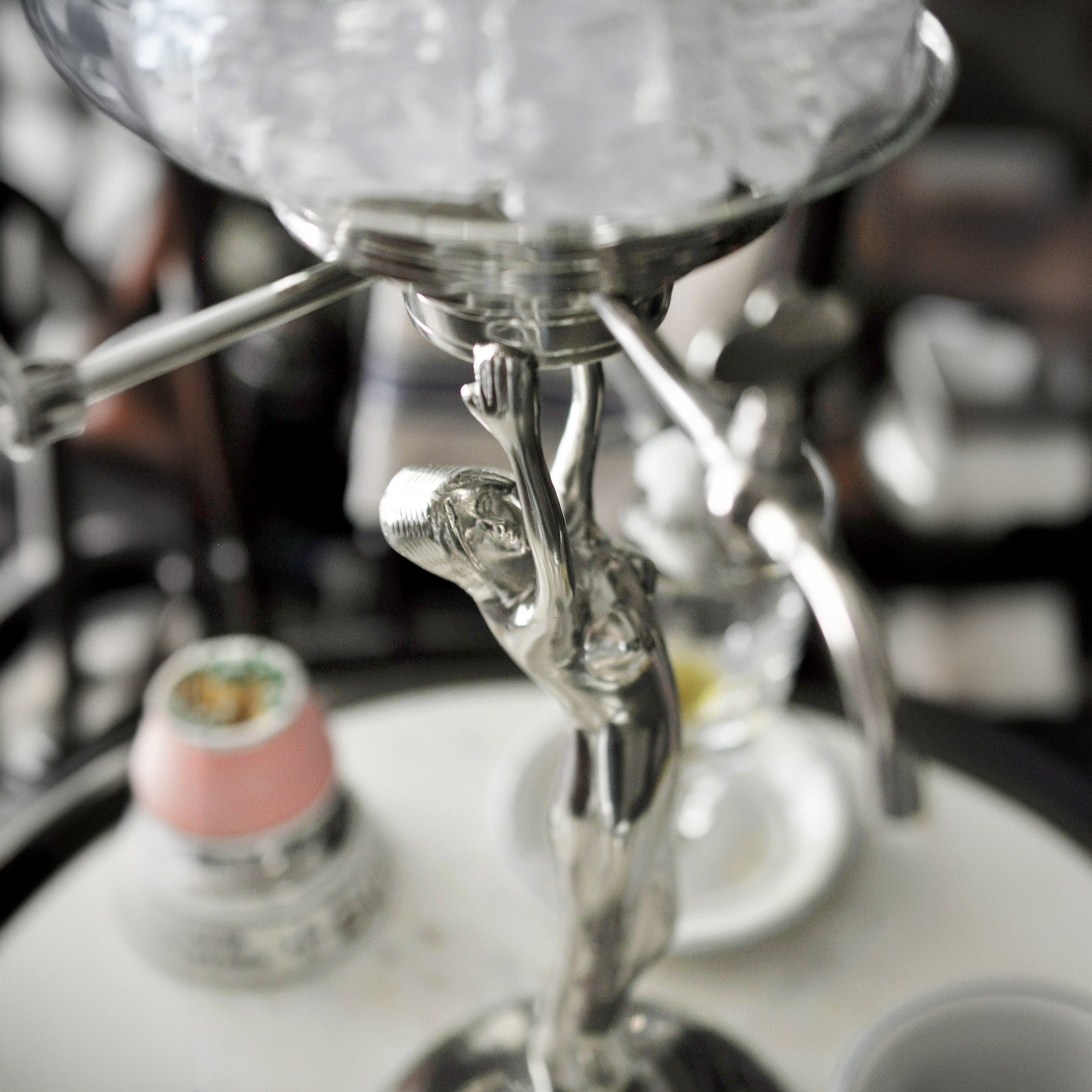 Le couvercle est orné du classique fleuron "ananas" et est amovible pour ajouter de l'eau glacée dans le bol en verre, qui comprend un filtre à eau, ce qui empêche la glace d'obstruer les becs. L'ananas représente l'hospitalité et l'amitié. Le bol en verre est soufflé à la bouche et la fontaine est fabriquée à la main.