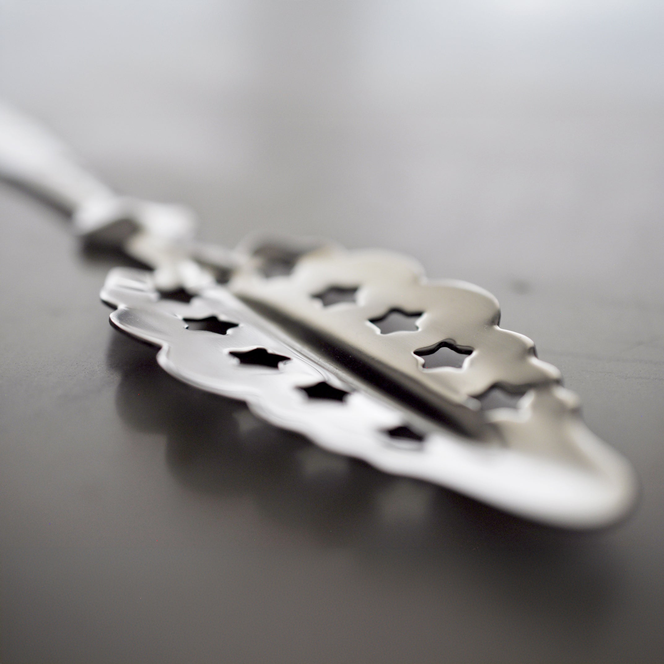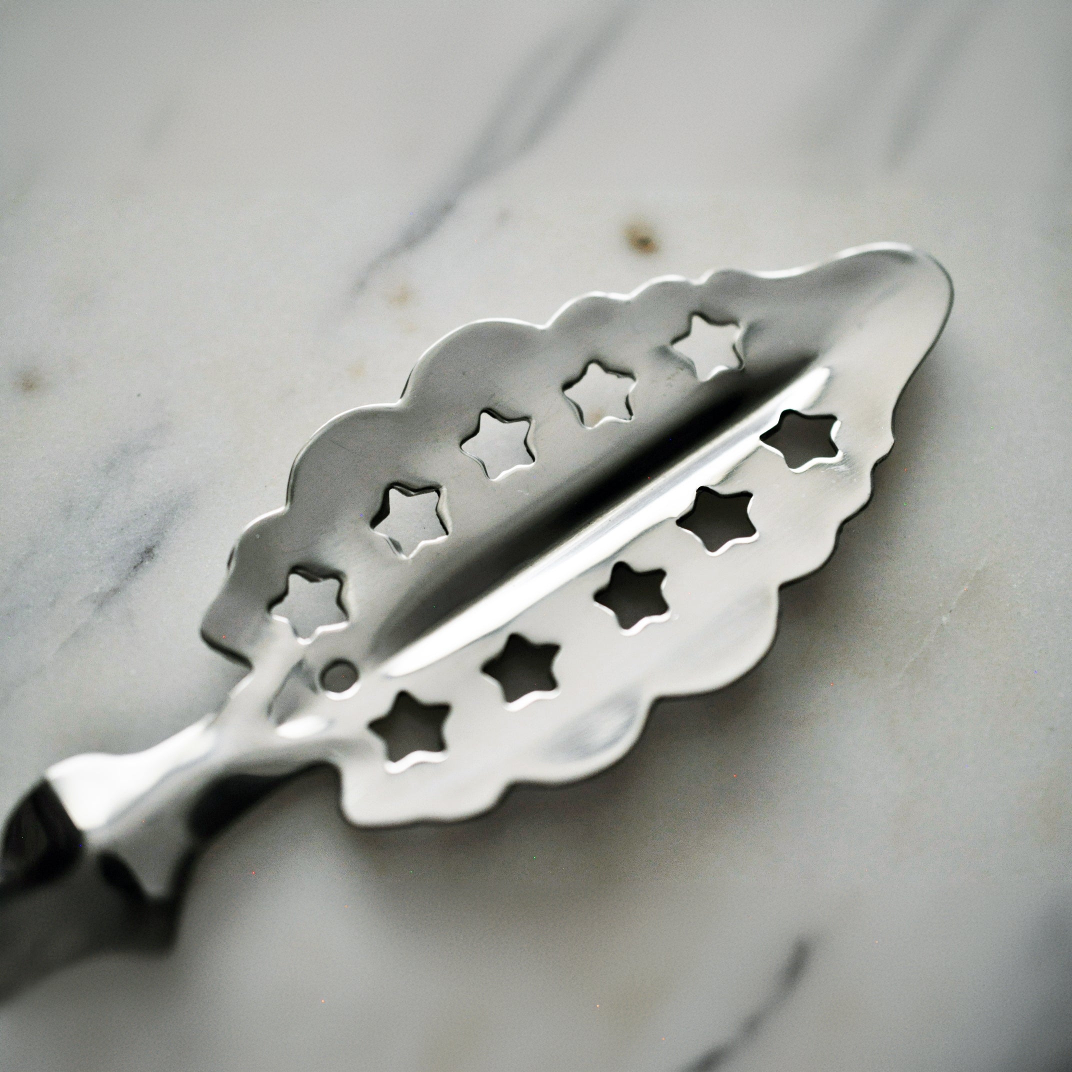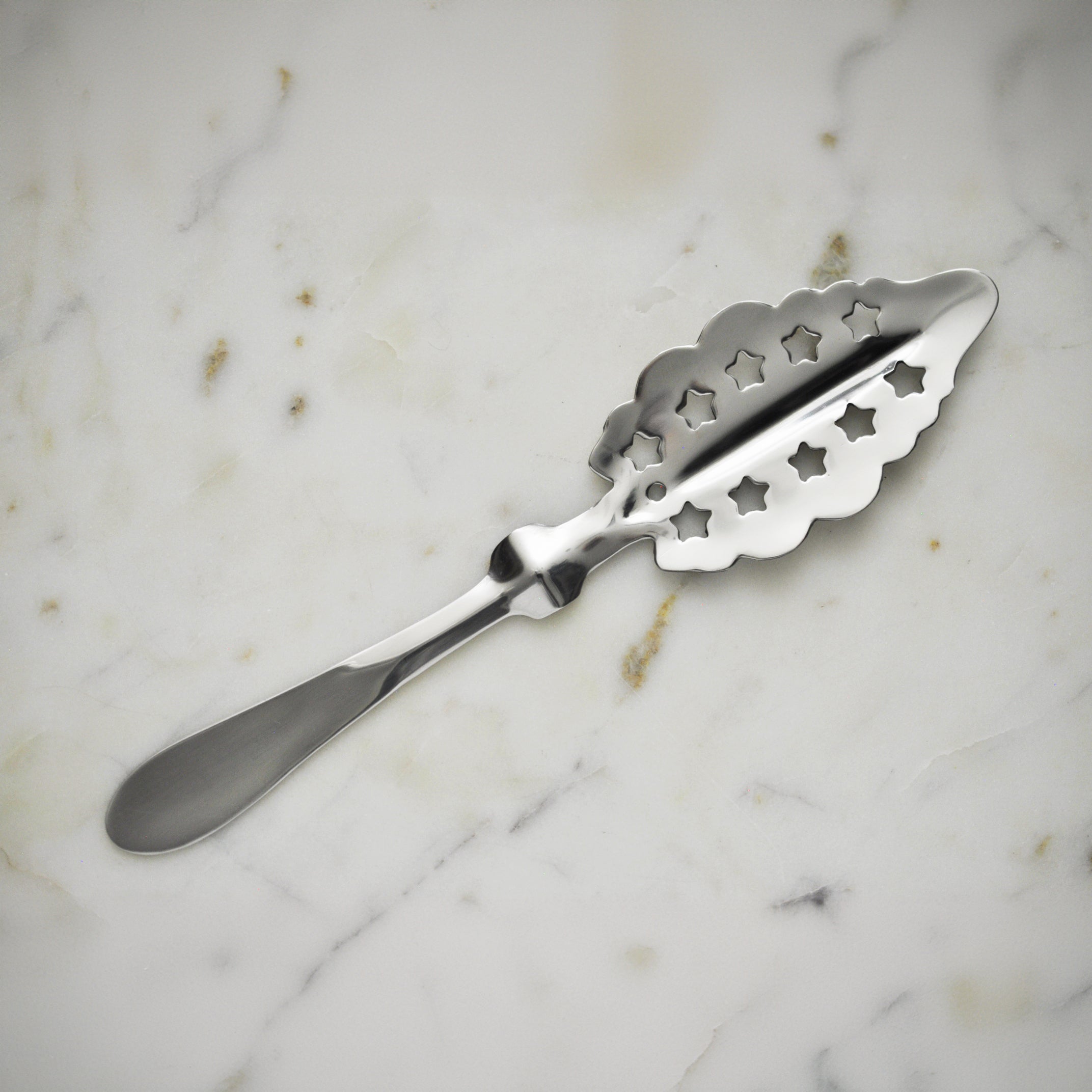 Cette cuillère à absinthe présente des bords latéraux festonnés et 10 grandes découpes en étoile dans sa grille. Un petit trou au bas de la colonne vertébrale facilite l'écoulement de l'eau sucrée. Cette cuillère est l'une de nos plus grandes et plus populaires. Elle est également la reproduction exacte d'une cuillère à absinthe de la fin du XIXe siècle.