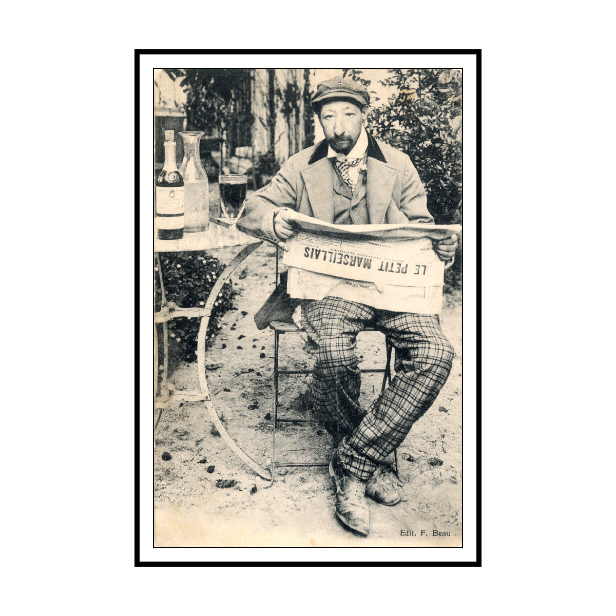 Cette affiche provient d'une carte postale française du début du XXe siècle, rare et de collection. Elle représente un personnage célèbre d'Avignon nommé « Crun-Crun ». En plus d'être un grand buveur d'absinthe, il était aussi un amuseur populaire, connu surtout pour jouer d'un violon monocorde. Il a malheureusement trouvé la mort lorsqu'un cheval lui a donné un coup de pied à la tête.