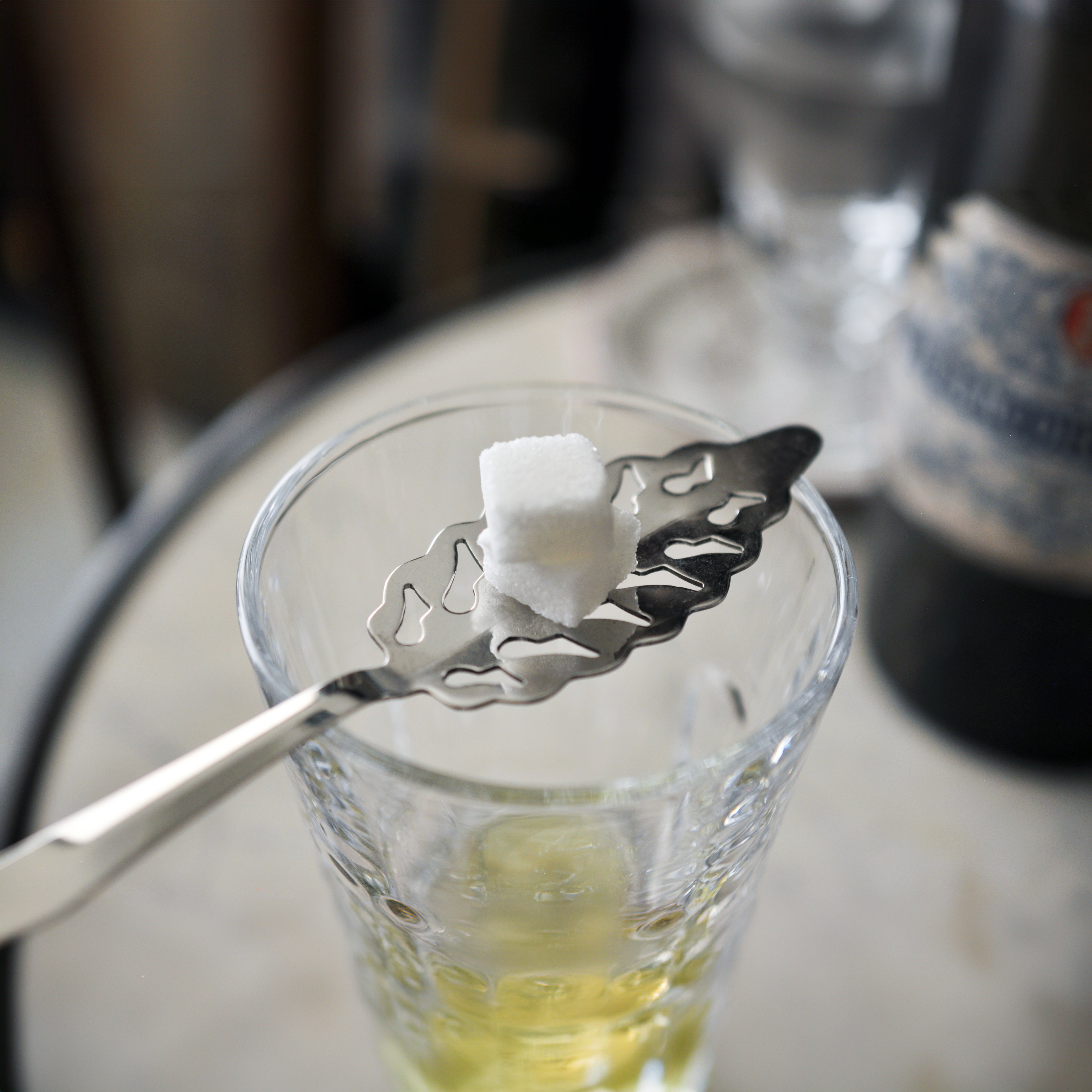 Cette cuillère est utilisée dans la préparation d'une absinthe traditionnelle française ou suisse. Une absinthe traditionnelle est préparée en versant une once d'absinthe dans un verre à absinthe, puis en plaçant la cuillère à absinthe sur le dessus du verre et un morceau de sucre sur la cuillère. De l'eau glacée s'écoule lentement d'une fontaine, d'une carafe ou d'un balancier sur le morceau de sucre. L'eau sucrée froide s'écoule ensuite de la cuillère dans le verre d'absinthe, libérant des huiles et parfumant l'air avec du fenouil, de la grande absinthe et de l'anis. La combinaison commence également à prendre une couleur blanc laiteux, car l'eau se mélange à l'anis.