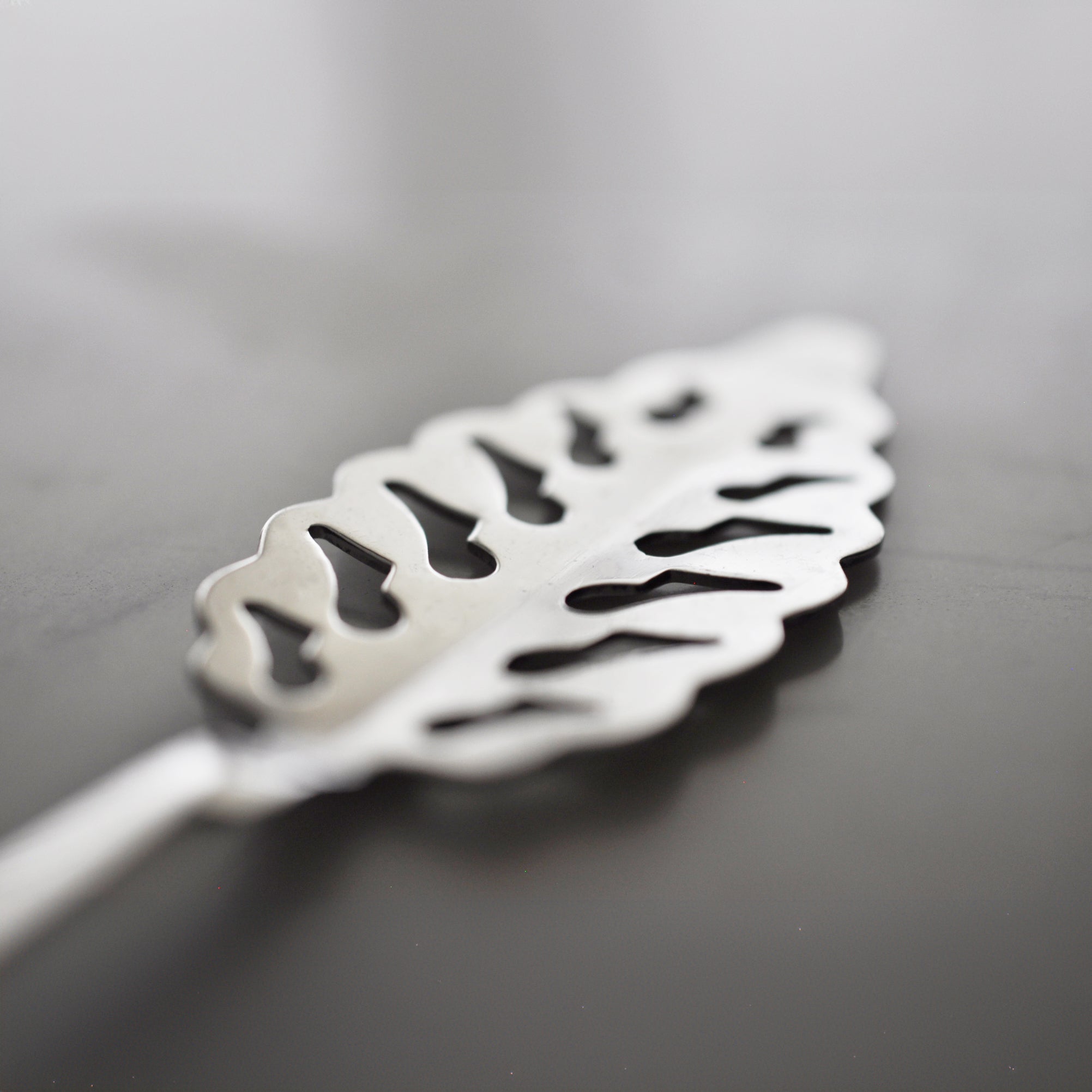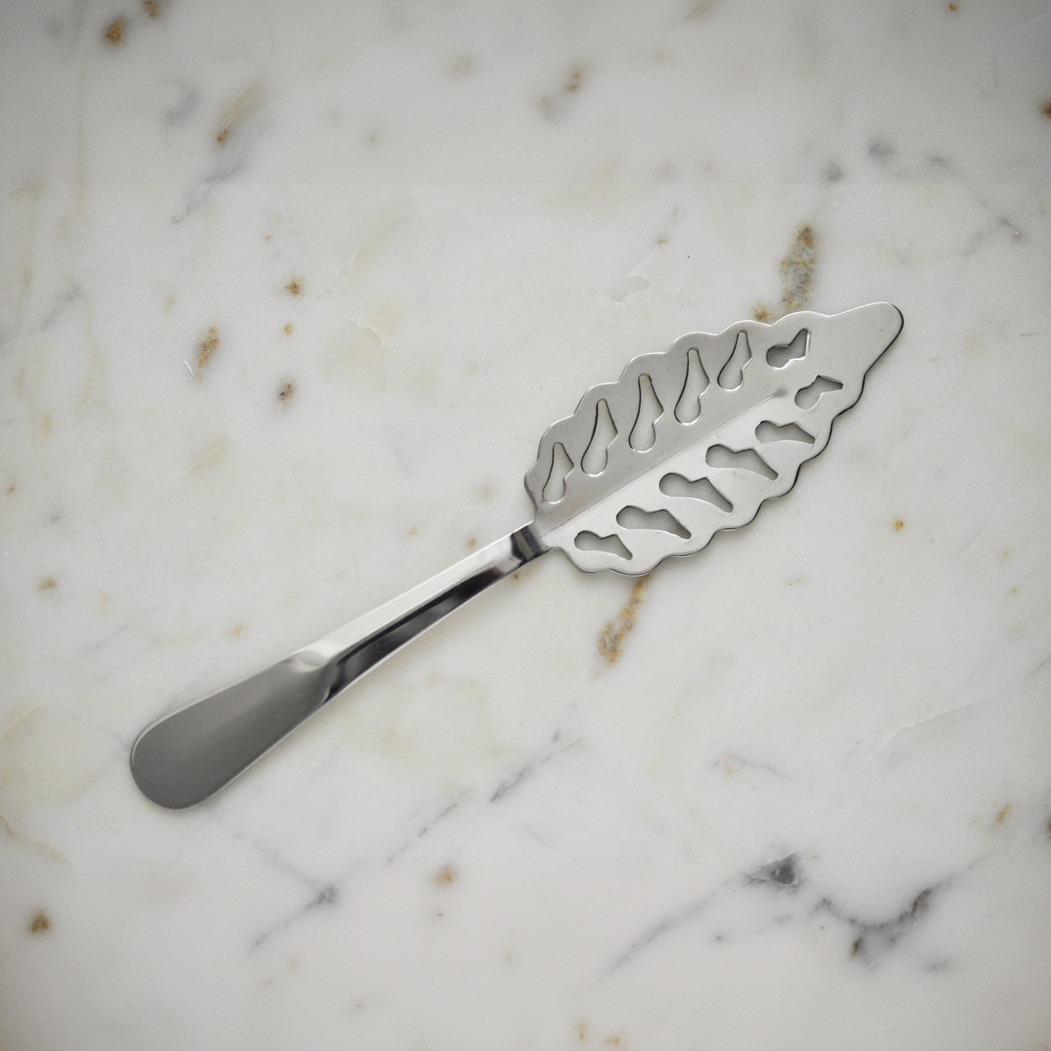Avec son beau design de feuilles, cette cuillère à absinthe est l'une de nos plus populaires. Les grandes découpes dans la grille de la cuillère permettent à l'eau sucrée de passer facilement à travers ses ouvertures et dans le verre d'absinthe. C'est une reproduction exacte d'une cuillère à absinthe de la fin du XIXe siècle.