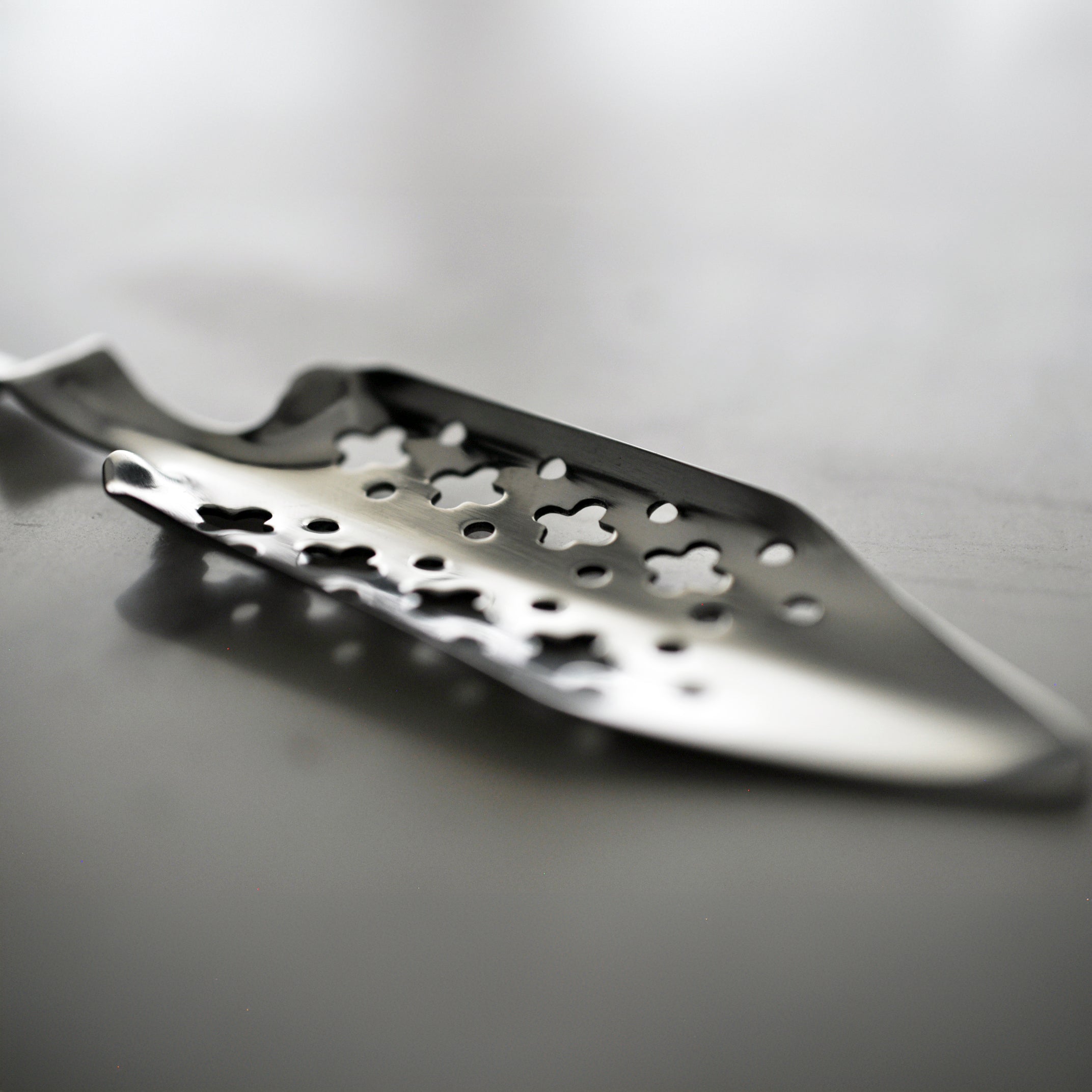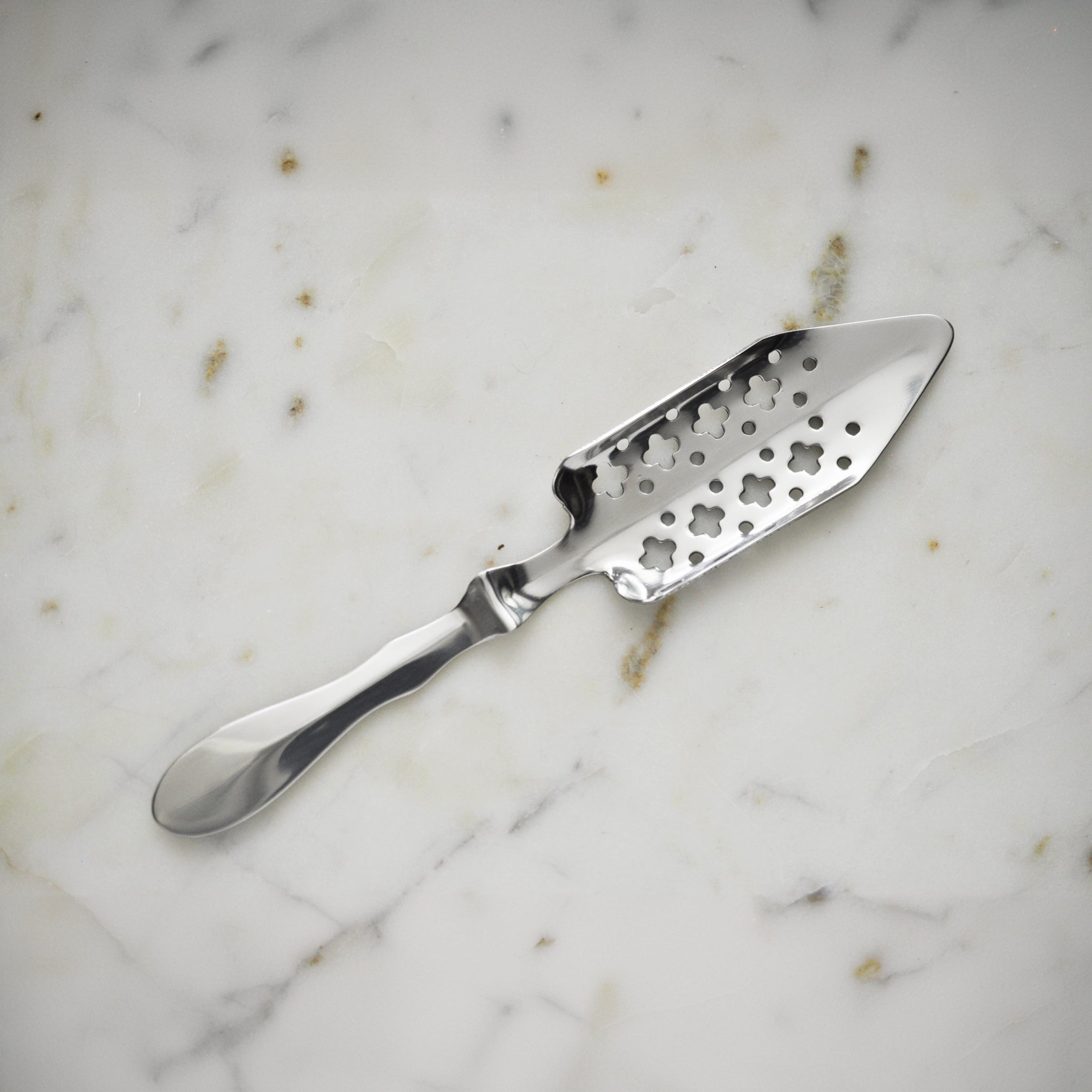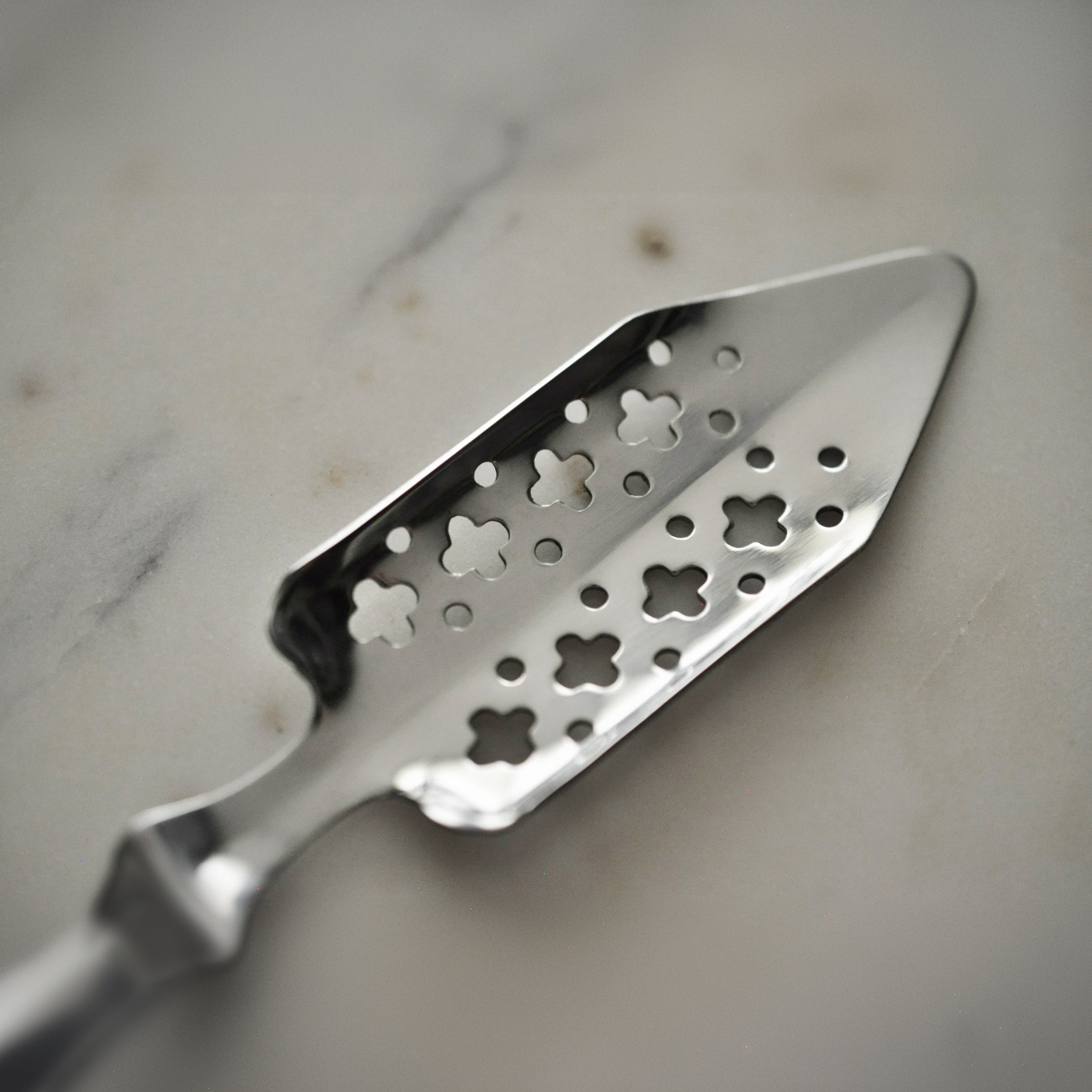Cette cuillère à absinthe était une cuillère populaire et courante dans les bars et les bistrots de France à la fin des années 1800. La surface de la cuillère (ou grille) contient 8 découpes transversales et 18 petits cercles. C'est une reproduction exacte d'une cuillère à absinthe de la fin du XIXe siècle.