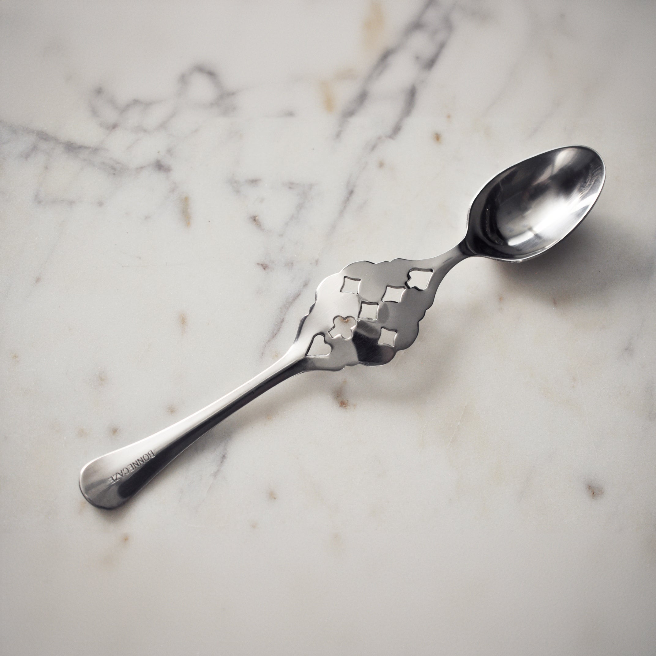 Ce type de cuillère est l'une des plus anciennes de toutes les cuillères à absinthe et est communément appelée "cuillère à cartes à jouer" en raison des dessins de cartes sur le gril, au milieu de son manche. Le gril sert à retenir le morceau de sucre pendant la préparation d'une absinthe française ou suisse traditionnelle.
