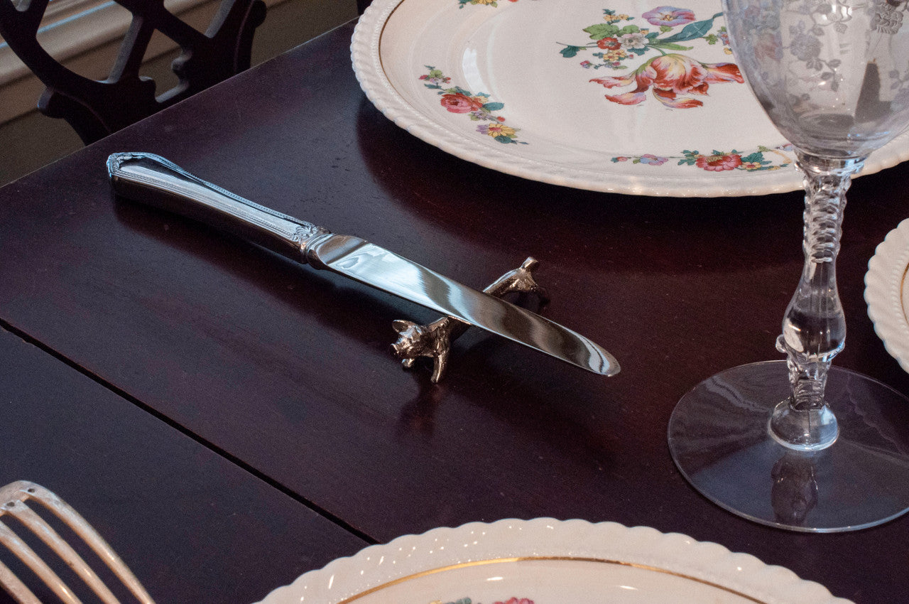Nos porte-couteaux en étain sont à la fois attrayants et pratiques en offrant un endroit pour reposer votre couteau pendant que vous mangez. Lorsqu'ils ne se servent pas de leur couteau à table, beaucoup de gens se rendent compte qu'il n'y a pas d'autre endroit pour poser leur couteau que sur le côté de leur assiette. Non seulement cette situation est peu attrayante, mais en plus, le couteau glisse souvent de l'assiette, salissant la table ou la nappe. Cette reproduction d'un porte-couteau français d'époque apporte une solution intéressante à ce problème et constitue un merveilleux moyen de compléter un service de table.