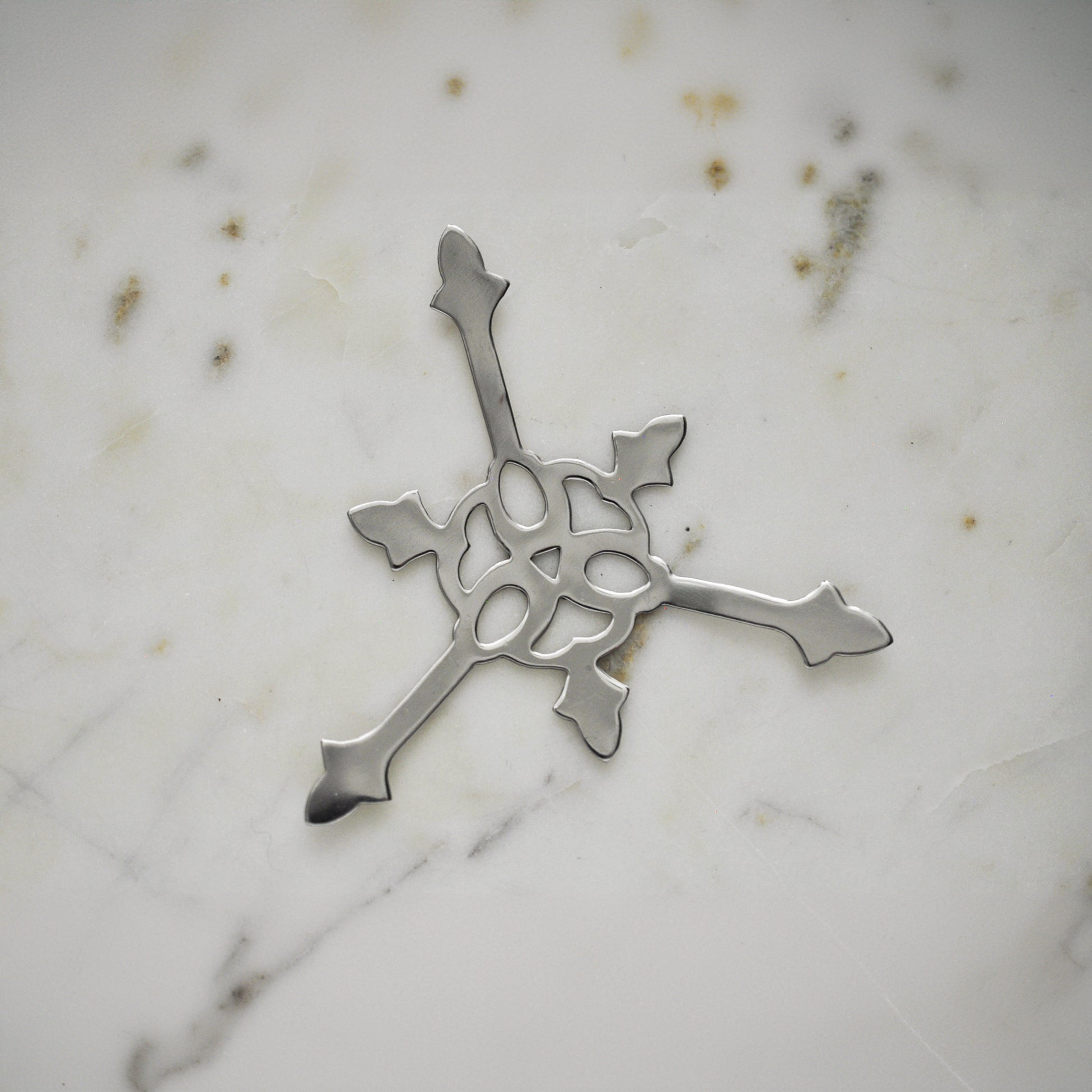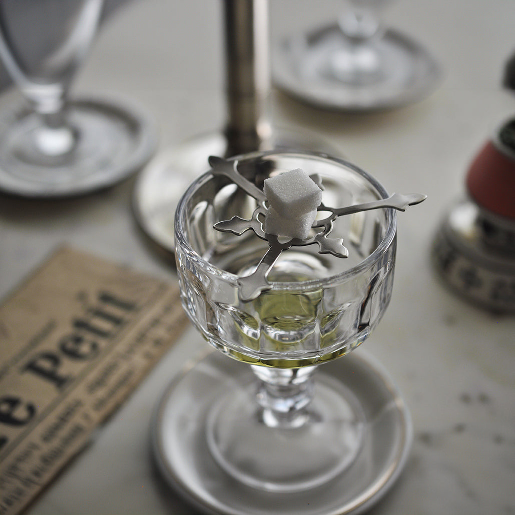 Cette grille en étoile fonctionne bien sur la plupart des vitres de toutes tailles. Grâce à la grande grille ouverte, le sucre et l'eau peuvent facilement s'égoutter dans le verre d'absinthe. Les trois bras s'assoient sur le verre et servent à tenir votre morceau de sucre. C'est une reproduction exacte d'une cuillère à absinthe de la fin du XIXe ou du début du XXe siècle.