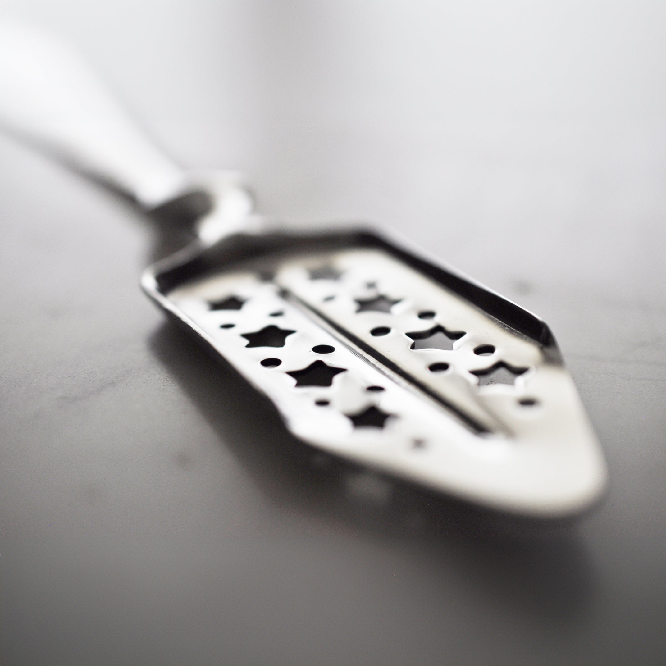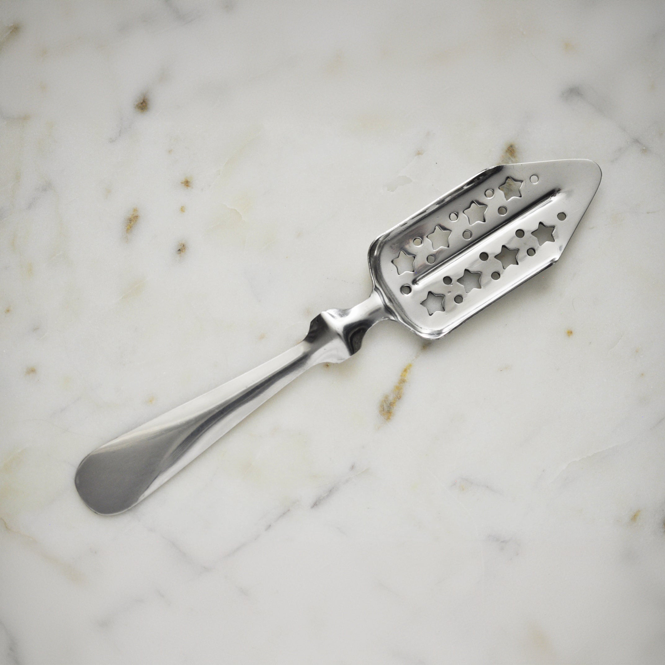Cette cuillère à absinthe française reproduite a 8 grandes étoiles mélangées à 14 petits trous dans la grille rectangulaire. Les grandes étoiles permettent à l'eau sucrée de tomber plus facilement dans le verre d'absinthe. C'est une reproduction exacte d'un dessin antique de la fin du XIXe siècle.