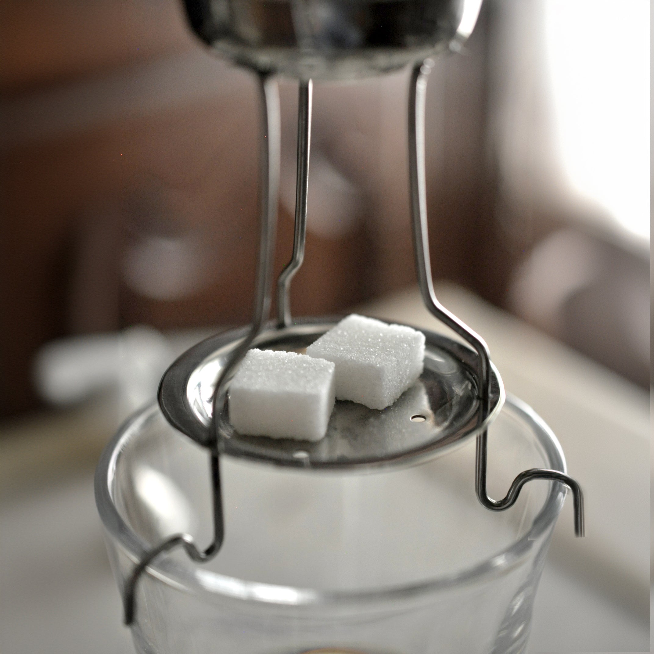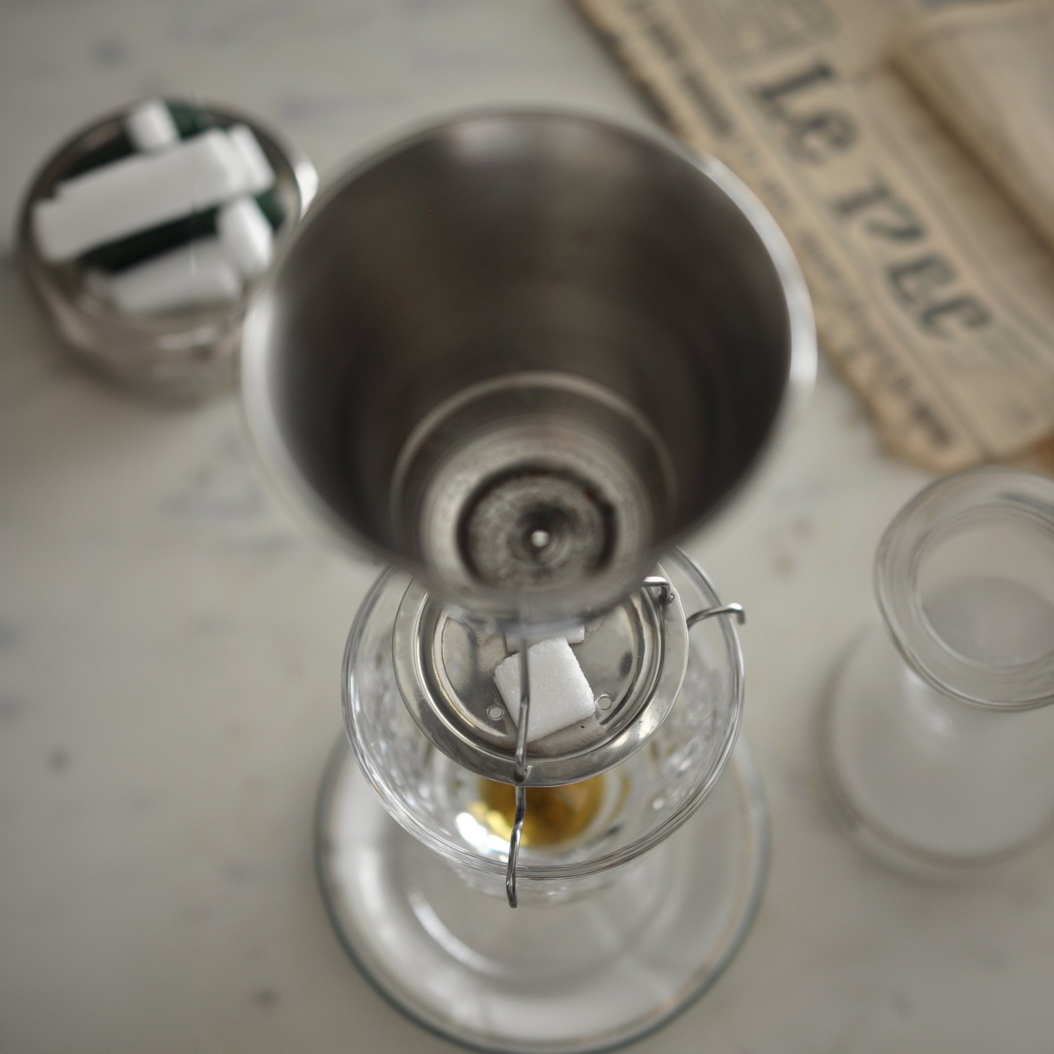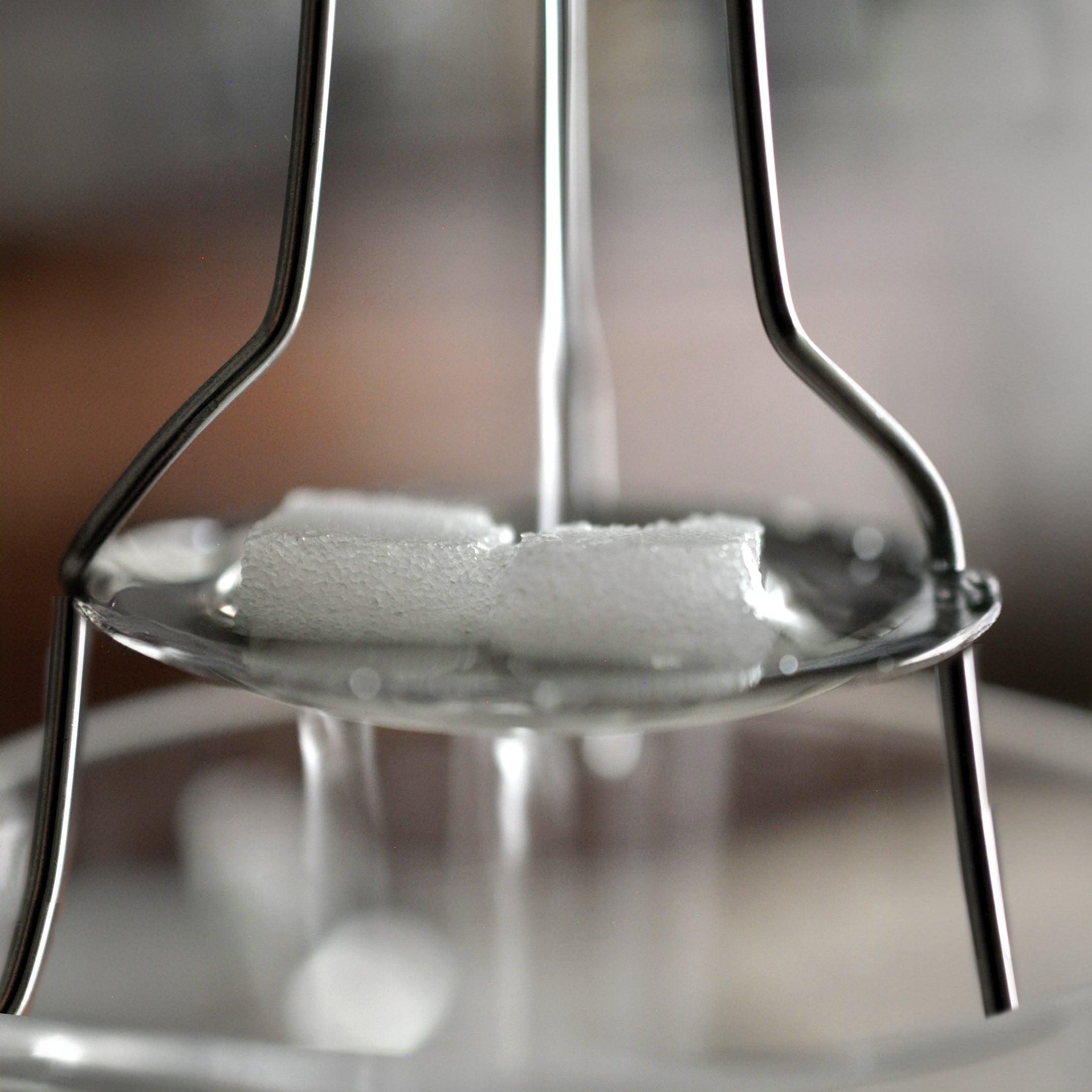 Une dose d'absinthe est d'abord versée dans le verre. Bien qu'une portion typique soit de 30 ml, la quantité dépend de la taille du verre utilisé. Le verse-eau est placé sur le rebord du verre, puis de la glace et des cubes de sucre sont placés sur le plateau rond sous l'entonnoir. De la glace est ajoutée à l'entonnoir et de petites quantités d'eau sont versées à l'intérieur à de courts intervalles. L'eau froide commence à couler, ou bruine, à travers un trou au fond de l'entonnoir sur le plateau contenant le morceau de sucre ci-dessous. La vitesse à laquelle l'eau tombe sur le sucre détermine la vitesse à laquelle le sucre se dissoudra. Une fois que le mélange d'eau sucrée tombe dans le verre d'absinthe. L'absinthe peut ensuite être échantillonnée et plus d'eau (et de sucre) peut être ajoutée si vous le souhaitez. La chose la plus importante à retenir lors de la préparation d'une absinthe est qu'elle doit être faite au goût des buveur. Remuez et dégustez !
