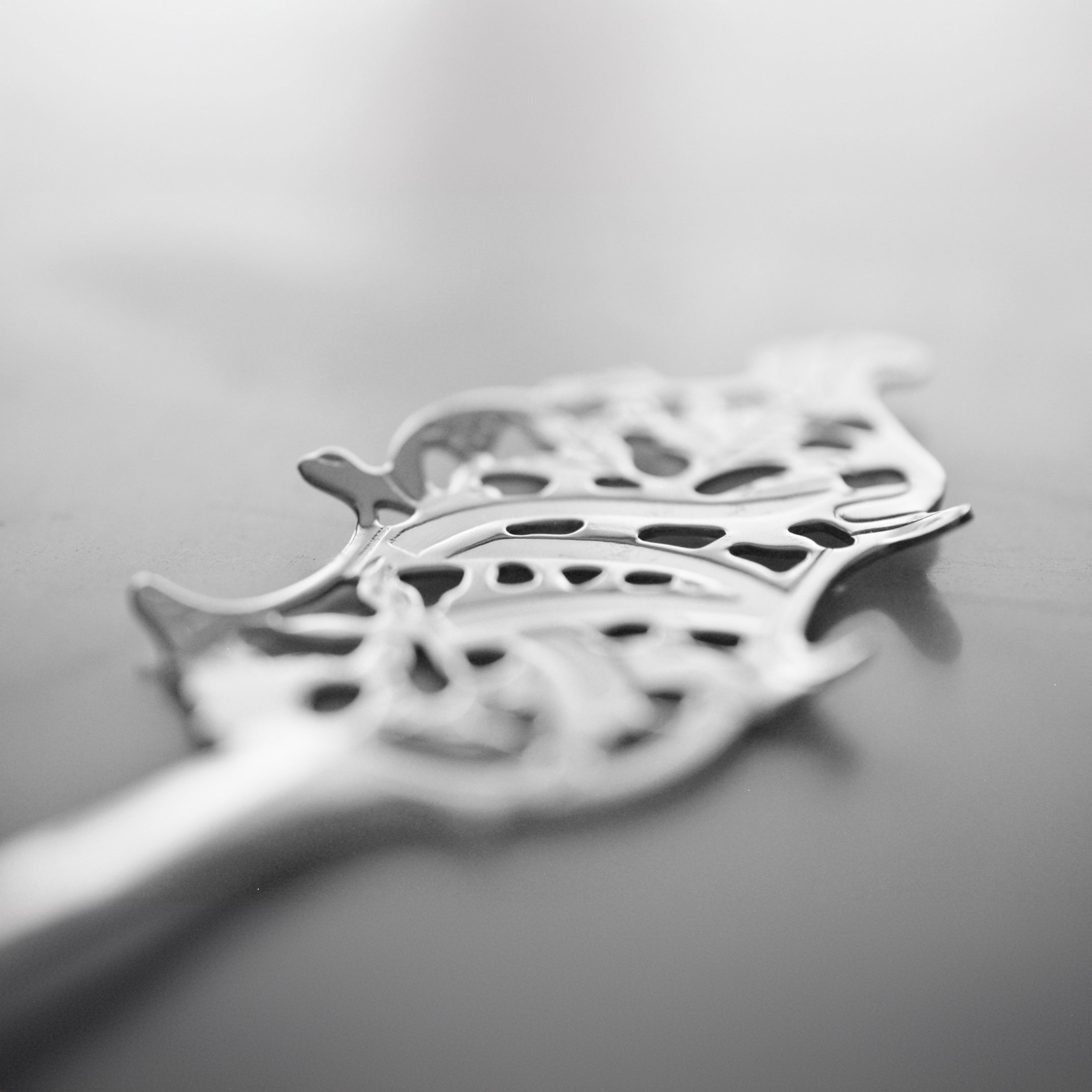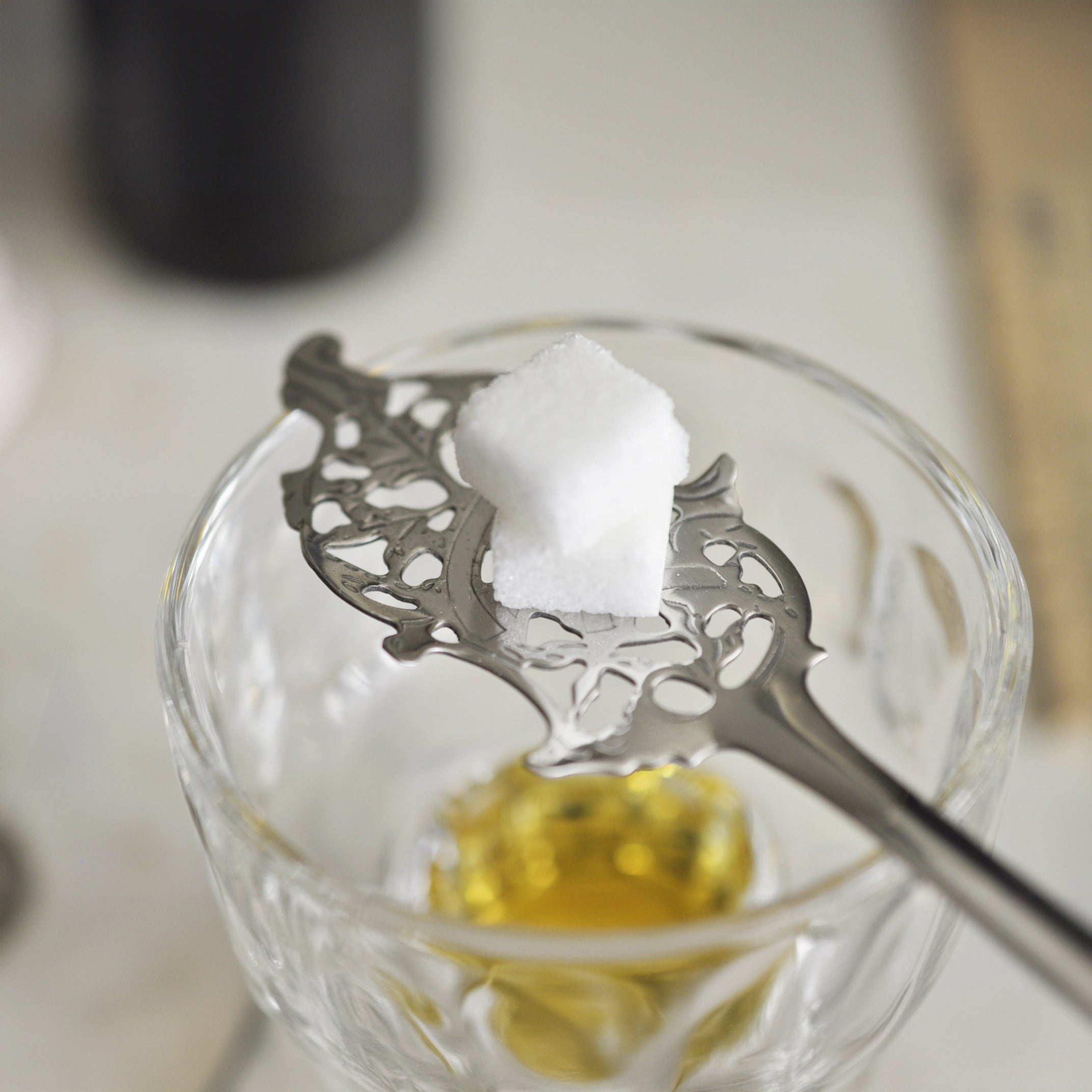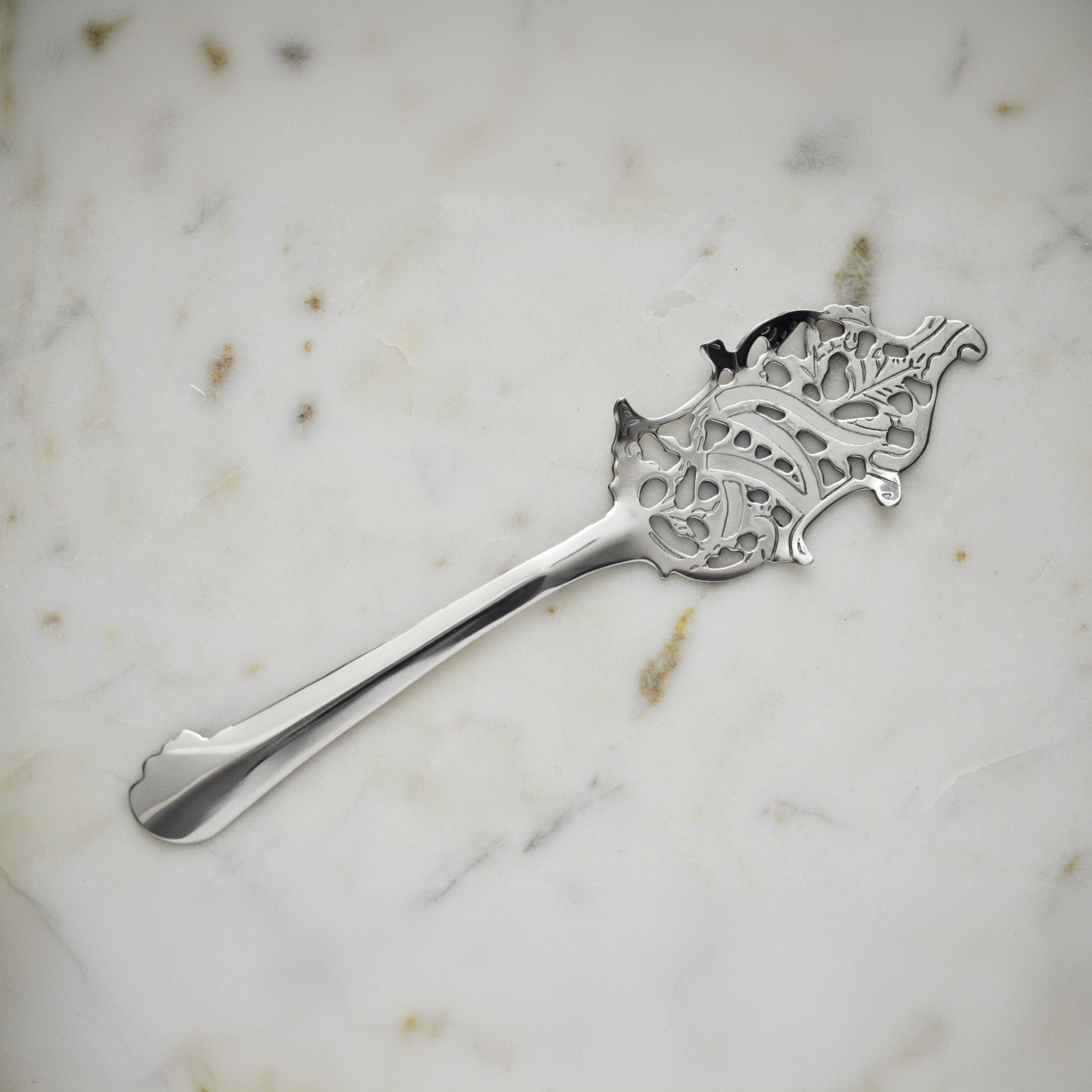 La cuillère à absinthe « La Feuille d'Absinthe » est de loin notre cuillère la plus désirée. C'est aussi l'une des cuillères les plus recherchées par les collectionneurs d'absinthe ancienne. La grille de la cuillère présente la grande absinthe, l'Artemisia absinthium (l'ingrédient clé de l'absinthe). La plante d'absinthe est entourée d'une bannière qui, sur les cuillères originales, contenait parfois un texte publicitaire. Le fond de la cuillère contient une petite zone striée qui servait à l'origine à séparer un morceau de sucre d'un pain de sucre (ou d'une motte), avant que les morceaux de sucre ne soient disponibles. La cuillère est une reproduction exacte du modèle original du XIXe siècle.