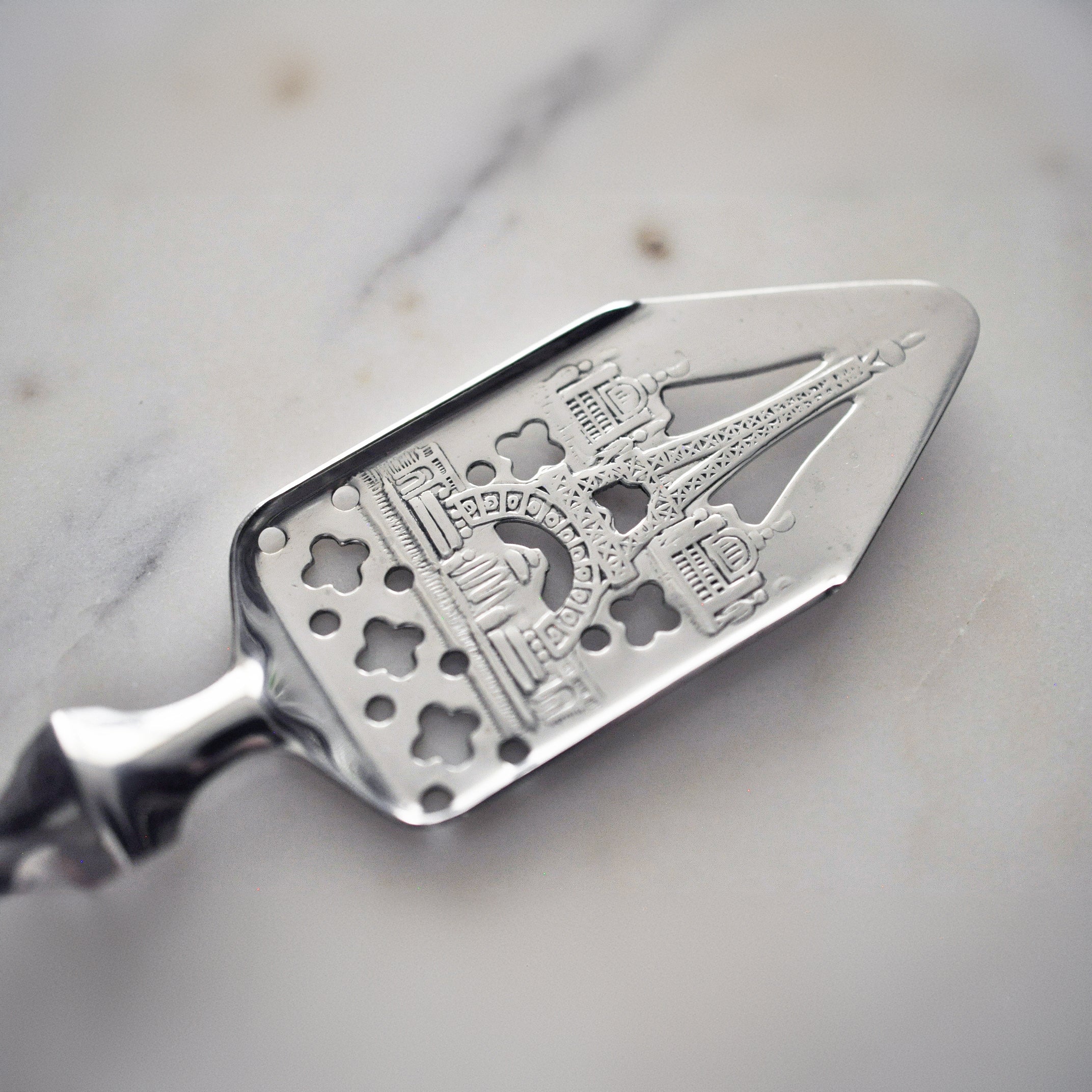 Cette reproduction de cuillère à absinthe fait partie des 8 cuillères à absinthe connues, fabriquées à l'origine pour célébrer l'introduction de la Tour Eiffel à l'Exposition Universelle, une exposition universelle qui s'est tenue à Paris, en France, en 1889. Il y a 3 cuillères avec le même design, mais avec des différences subtiles, ce qui rend les originaux très collectionnables. Le gril de la cuillère présente un beau dessin de la Tour Eiffel située dans le Champ de Mars, le parc qui entoure la tour. Il s'agit d'une reproduction exacte d'une cuillère à absinthe de la fin du XIXe siècle.