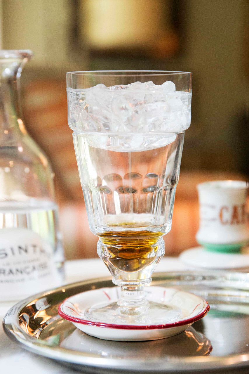 Une dose d'absinthe est d'abord versée dans le verre et le verre Verse-Eau est placé sur le dessus du verre. De la glace est ensuite placée à l'intérieur du verre Verse-Eau et de l'eau est lentement versée sur la glace à partir d'une carafe ou d'un pichet. L'eau glacée commencera à couler à travers un petit trou situé à son fond dans l'absinthe ci-dessous.
