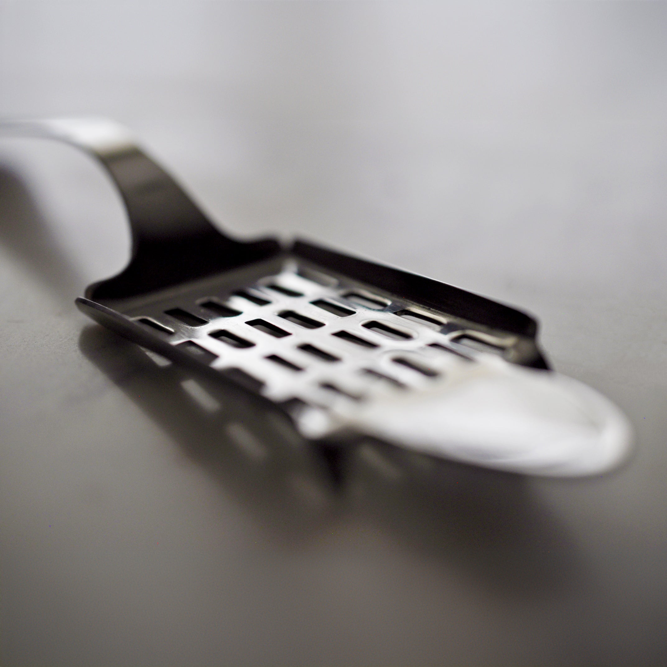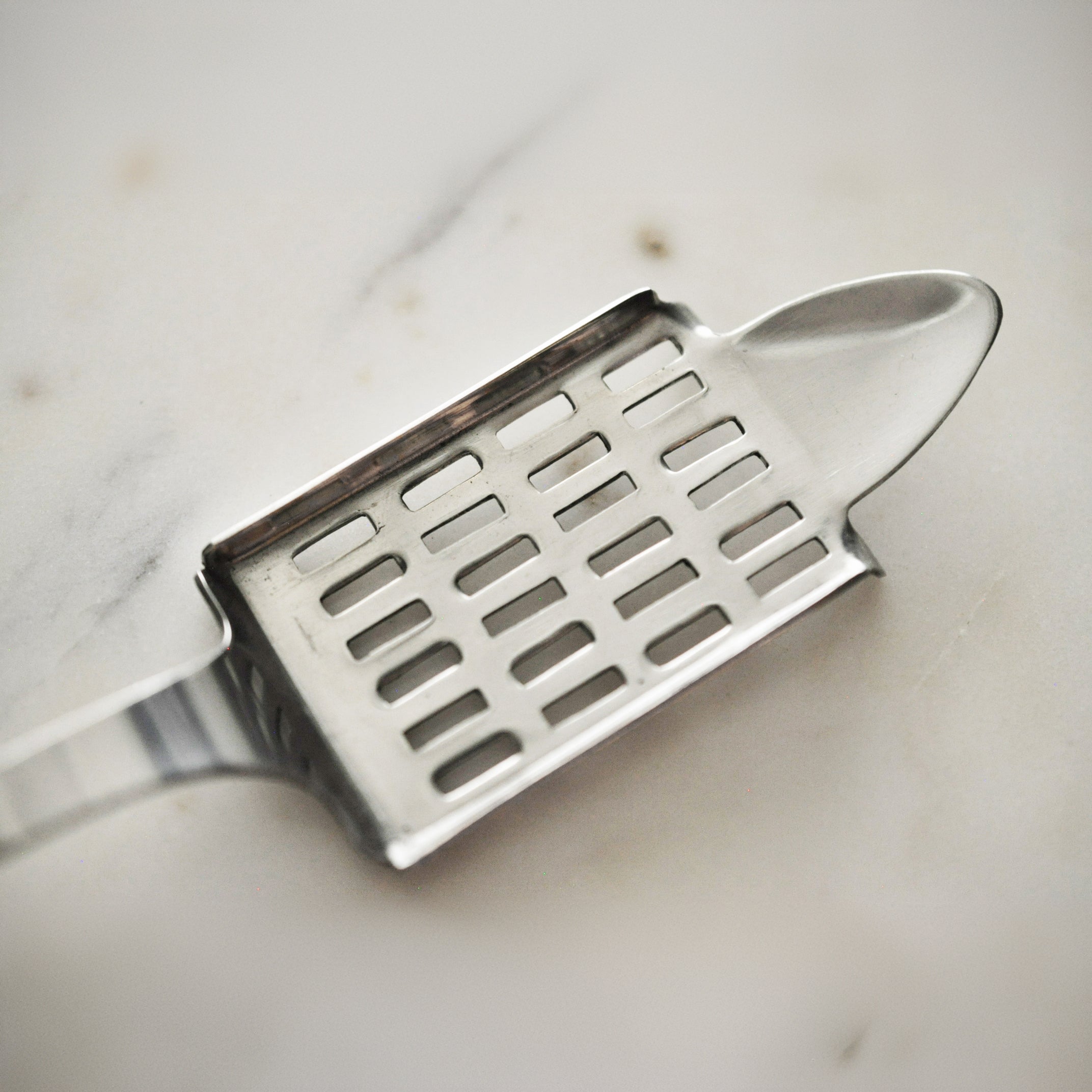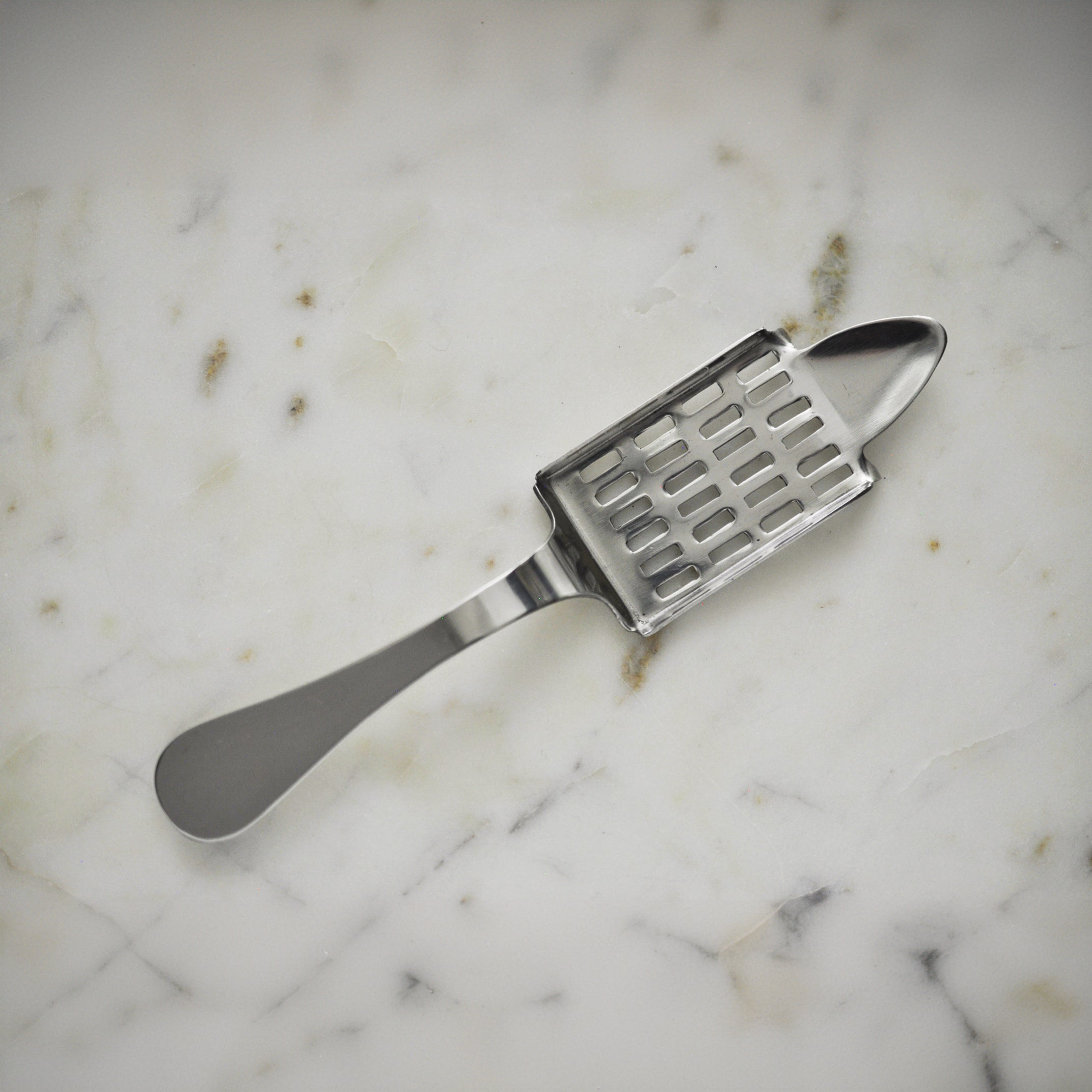 Cette cuillère unique possède l'une des plus grandes grilles de toutes nos cuillères à absinthe. Sous le bout de la cuillère se trouvent deux dents qui s'accrochent au bord du verre pour empêcher la cuillère de bouger. La cuillère a été inspirée par les designs modernistes de plus en plus populaires de l'époque. C'est une reproduction exacte d'une cuillère à absinthe de la fin du XIXe siècle.