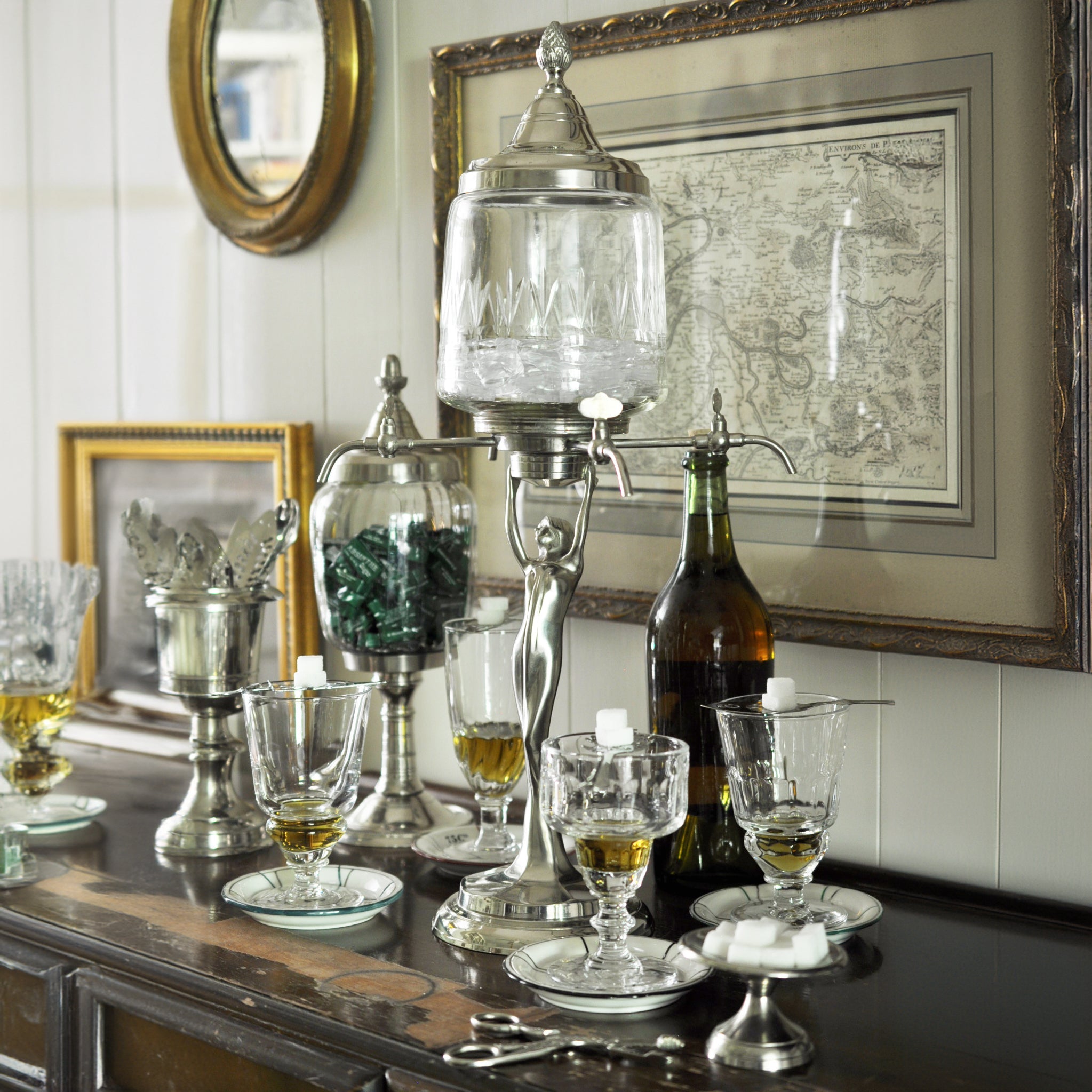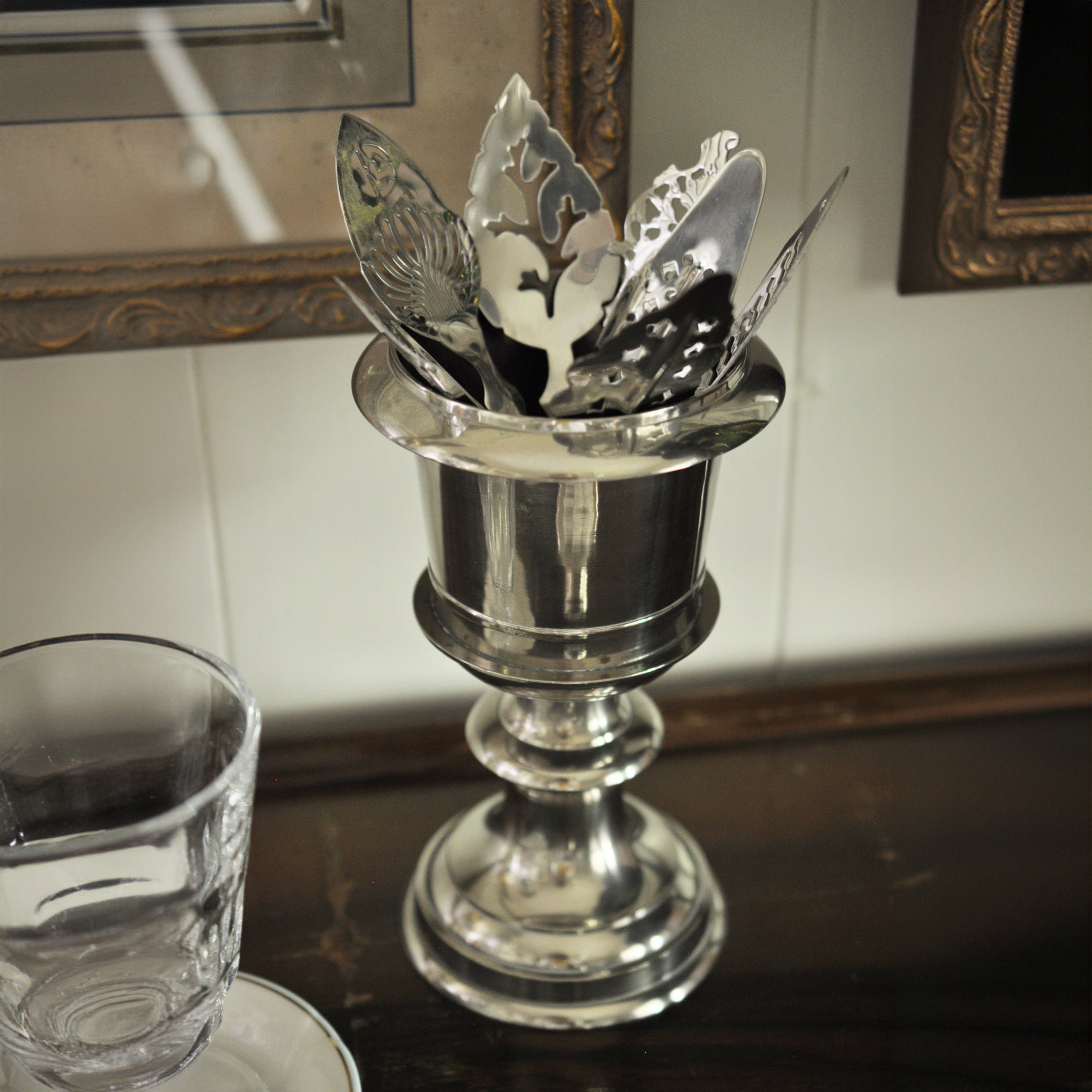 Les porte-cuillères (également appelés tronc de comptoirs en France) se trouvaient généralement sur les comptoirs des bistrots et des bars, utilisés pour tenir les cuillères en attendant "le rituel". Le rituel de l'absinthe commence en versant une quantité d'absinthe dans un verre à absinthe, puis en plaçant une cuillère à absinthe sur le dessus du verre et un morceau de sucre sur la cuillère. De l'eau glacée est lentement versée d'une fontaine, d'une carafe ou d'un balancier sur le morceau de sucre. L'eau sucrée froide s'écoule ensuite de la cuillère dans le verre d'absinthe, libérant des huiles et parfumant l'air avec du fenouil, de la grande absinthe et de l'anis. La combinaison commence également à prendre une couleur blanc laiteux, car l'eau se mélange à l'anis. En plus d'être pratique, c'est un excellent moyen d'exposer vos cuillères.