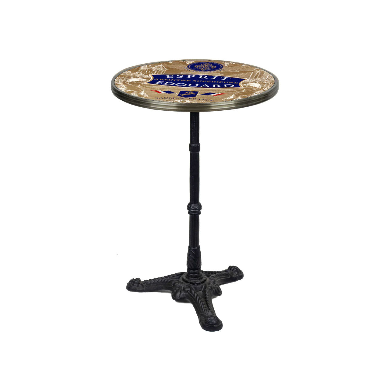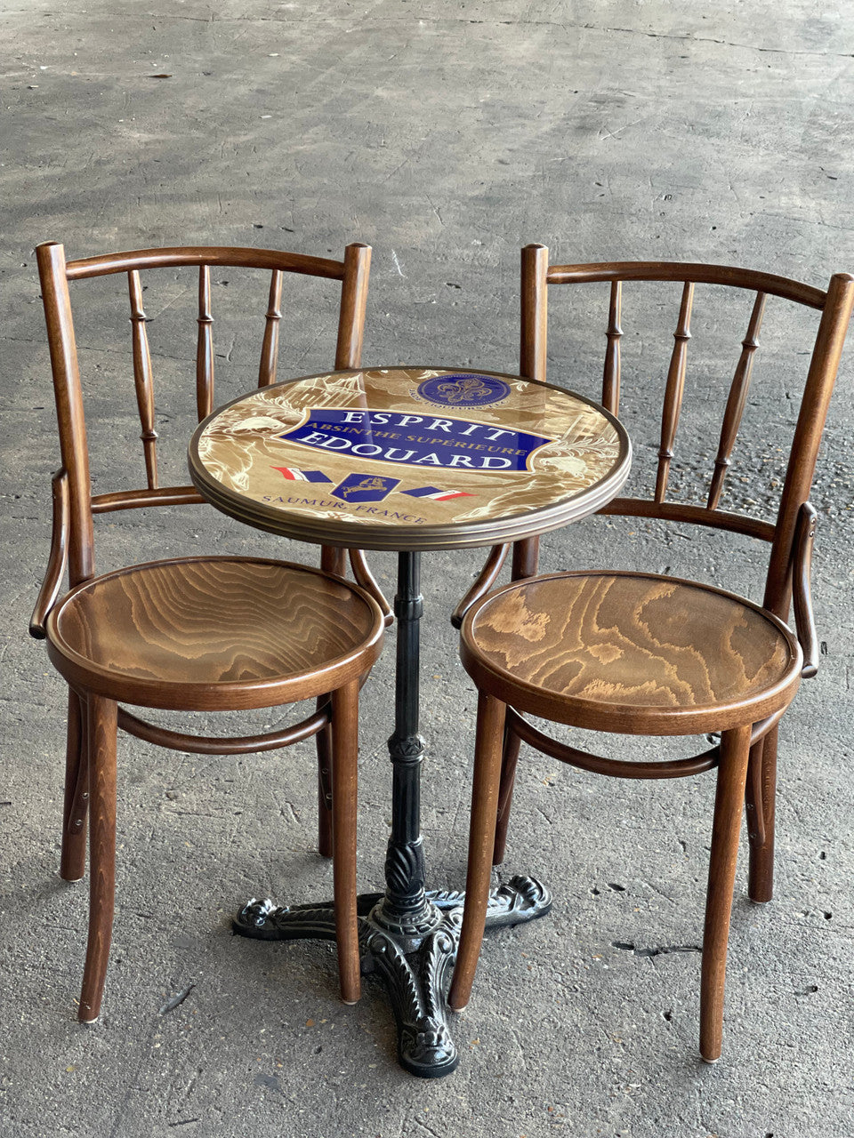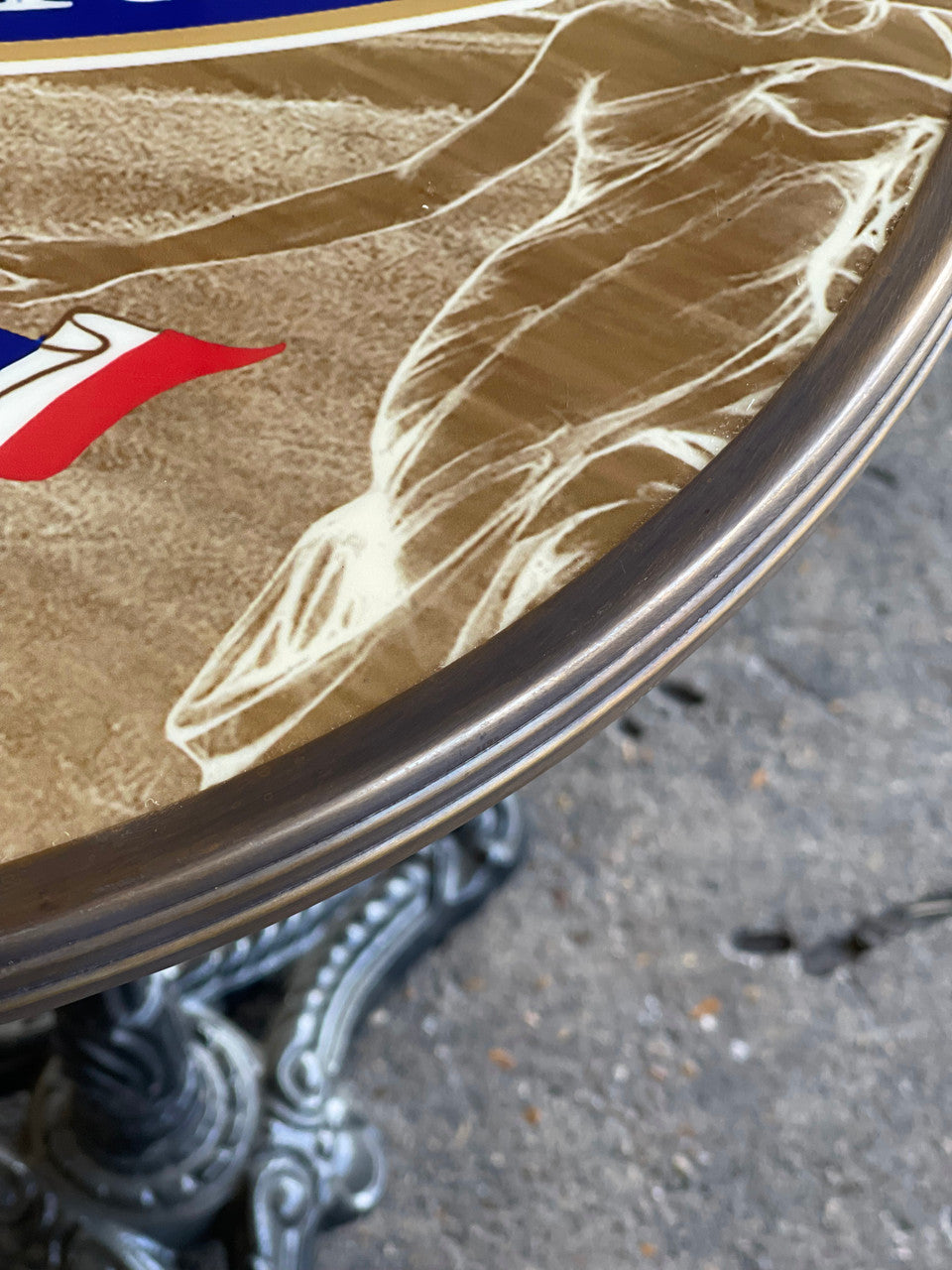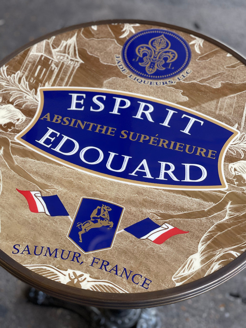 Cette magnifique table de bistrot est ornée de la marque d'absinthe Esprit Edouard de Jade Liqueurs. Jade Liqueurs est considéré comme l'un des fabricants d'absinthe d'avant l'interdiction (avant 1915) les plus respectés et les plus fidèles à l'histoire sur le marché mondial. L'Esprit Edouard est considérée comme l'une de ses meilleures marques.