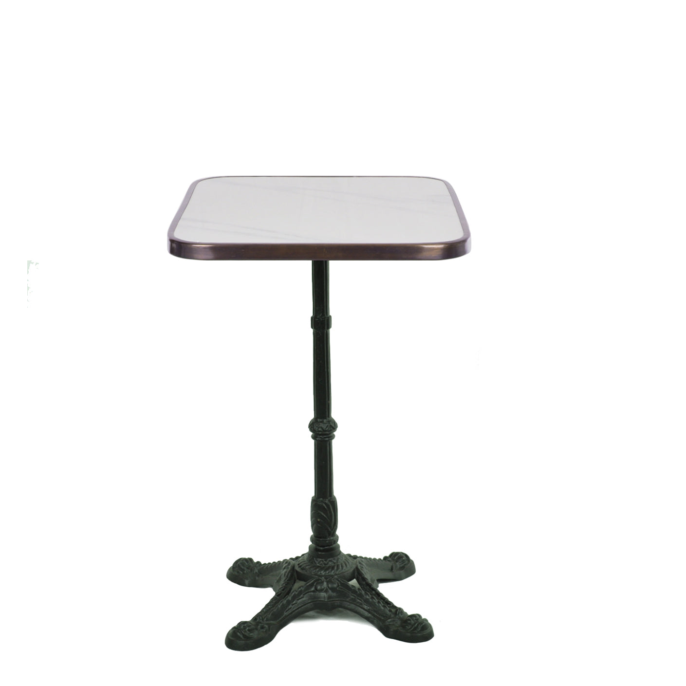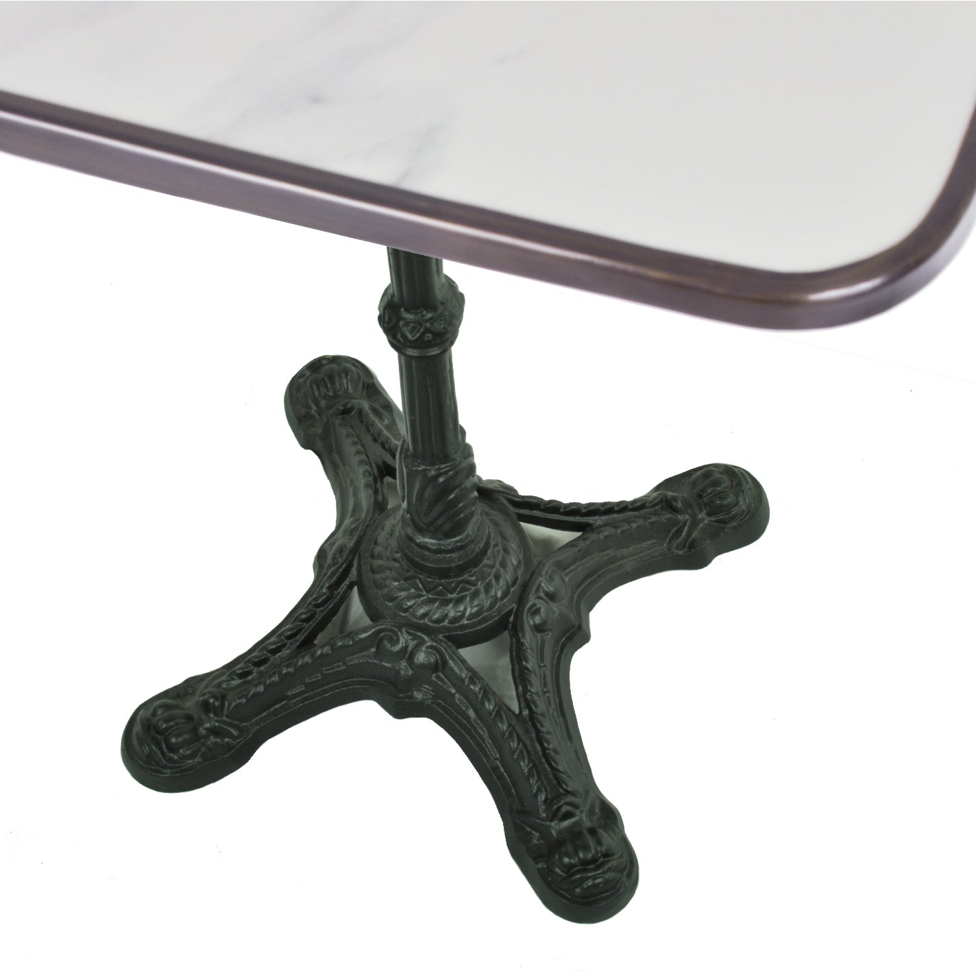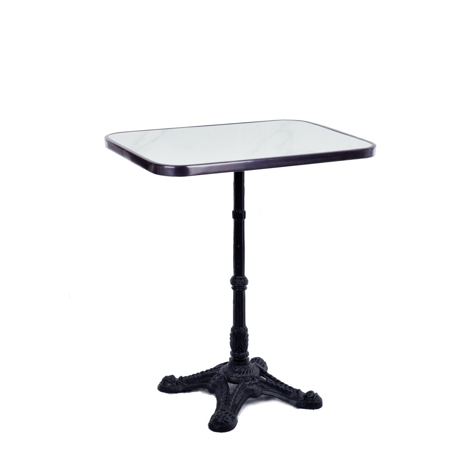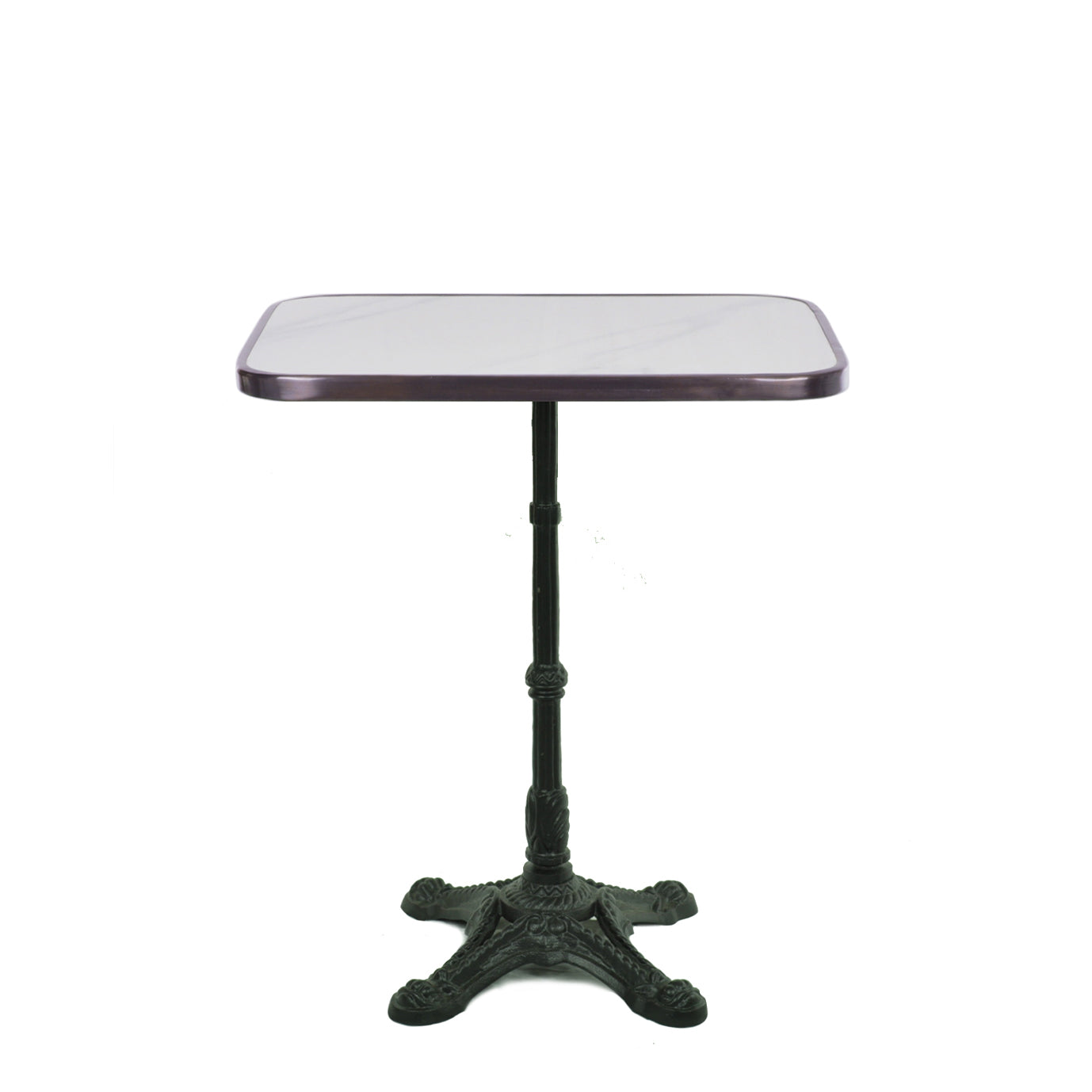 Cette table de bistrot rectangulaire française est idéale pour un usage hôtelier. Le plateau en céramique a l'aspect et la sensation du marbre, mais il s'agit d'une alternative plus solide et plus durable. La céramique n'absorbe pas les liquides et n'a jamais besoin d'être scellée. Elle est également plus légère que le marbre, ce qui rend la table plus facile à déplacer.