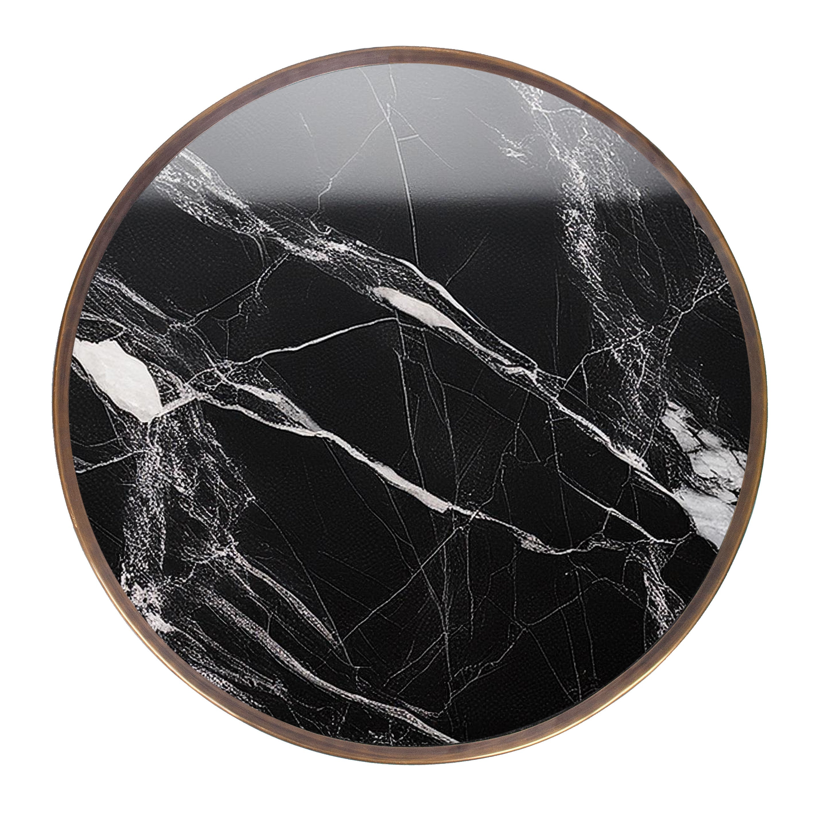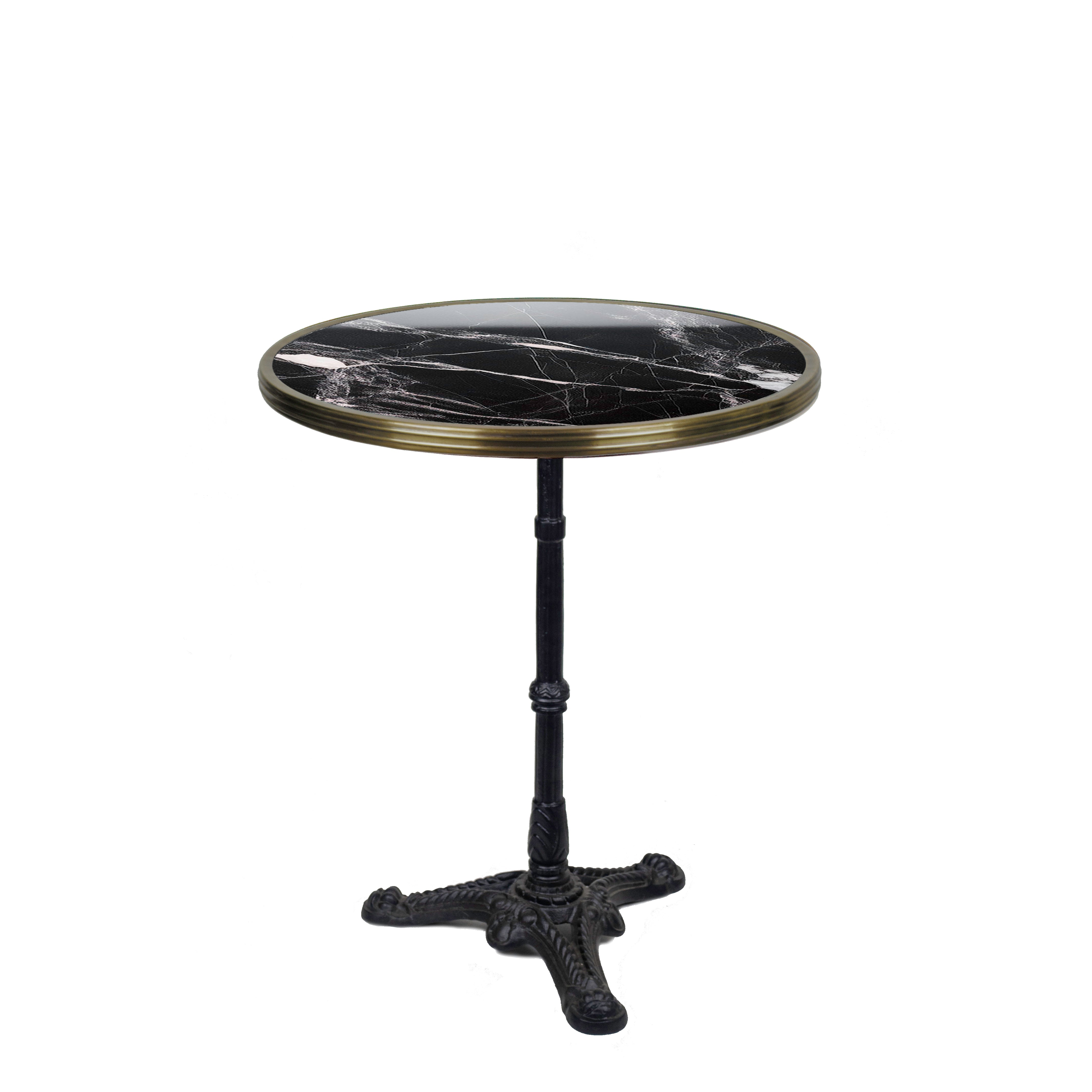 Le bord en laiton est doté d'une bande de laiton vieillie et sans couture entourant le bord de la pierre. La base présente les mêmes détails qu'une table de bistrot française du début du XXe siècle. Nous avons reproduit le processus de construction, y compris la façon dont le marbre est fixé à la table.