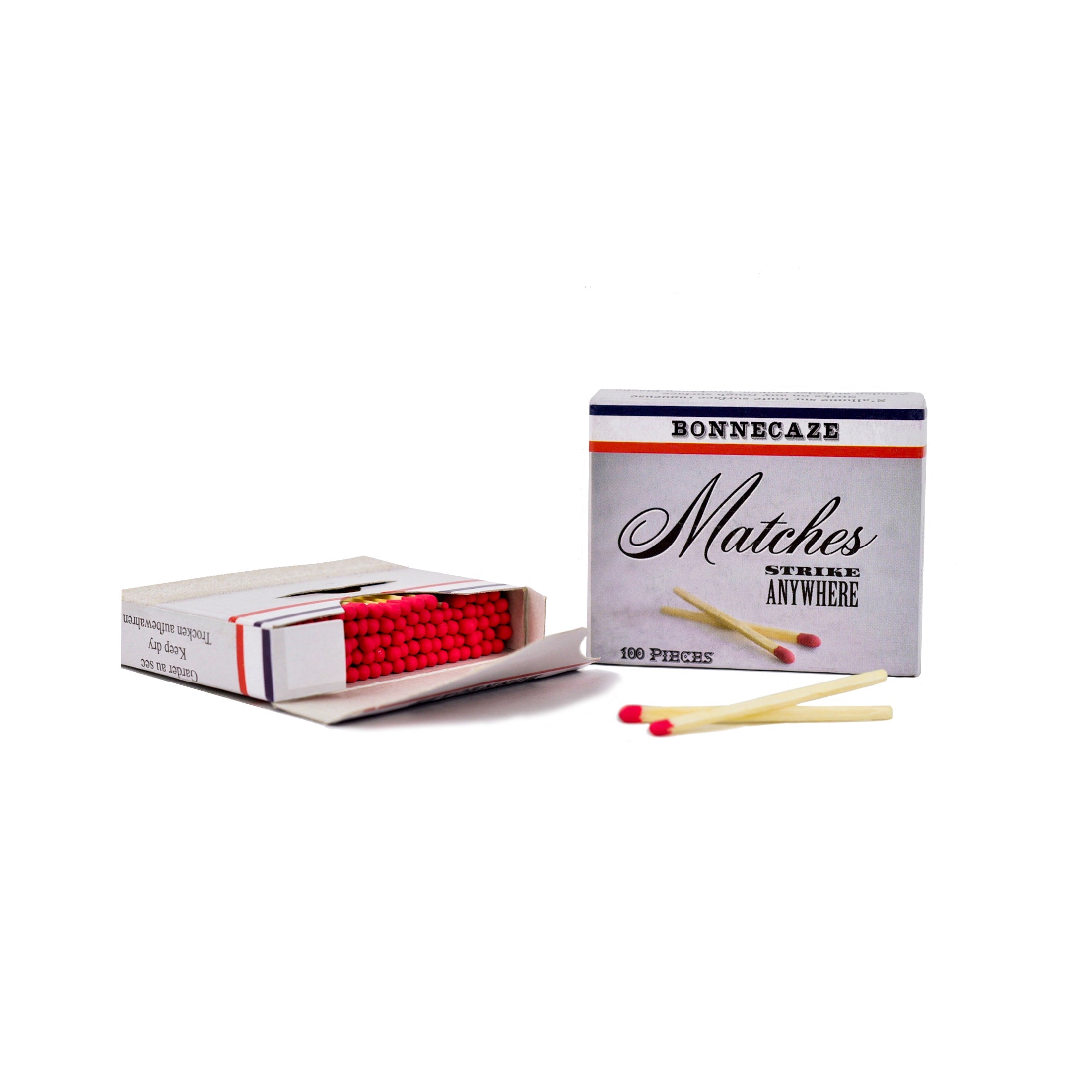 Les allumettes « allumer partout » sont conçues pour s'enflammer facilement et rapidement sur une variété de surfaces, contrairement aux allumettes qui ne s'enflamment que lorsqu'elles sont frappées sur leur boîte. Ces allumettes à longue tige (de cuisine) s'enflamment facilement sur les côtes situées sur nos pyrogènes, tout comme les originaux antiques d'il y a plus de 100 ans.